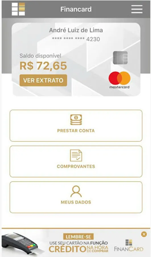 With App Financard, you have the management of your corporate expenses in the palm of your hand! In addition to the balance and extract of your Financard card in just one click, you will also be accountable for all expenses, thus avoiding manual reports that generate waste of time. Accounts payable for your expenses, it's never been easier, the account button on the home screen in the App, you select the type of expense, such as travel expenses, photographs the voucher and send online to your company's management system . Your company has access to all your expenses and images of the vouchers, thus closing the reporting cycle and avoiding manual expense reports.