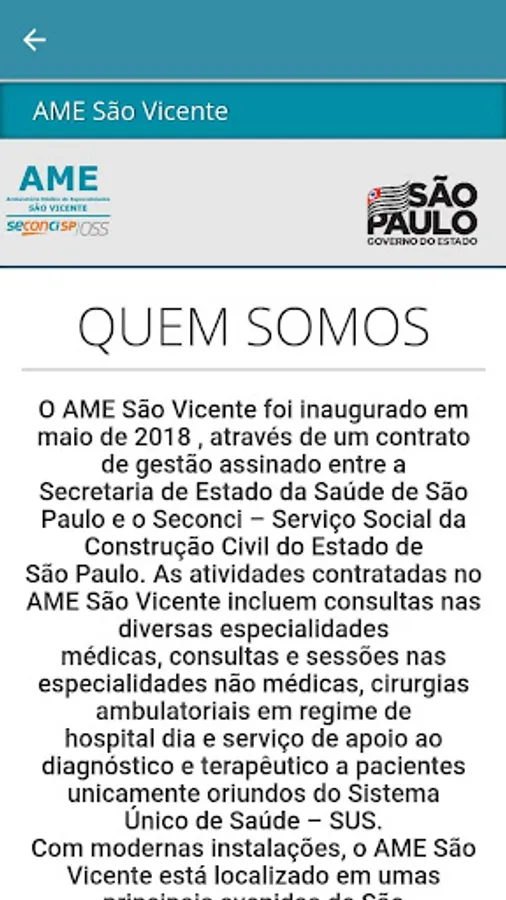 AME São Vicente was inaugurated in May 2018 through a management contract signed between the