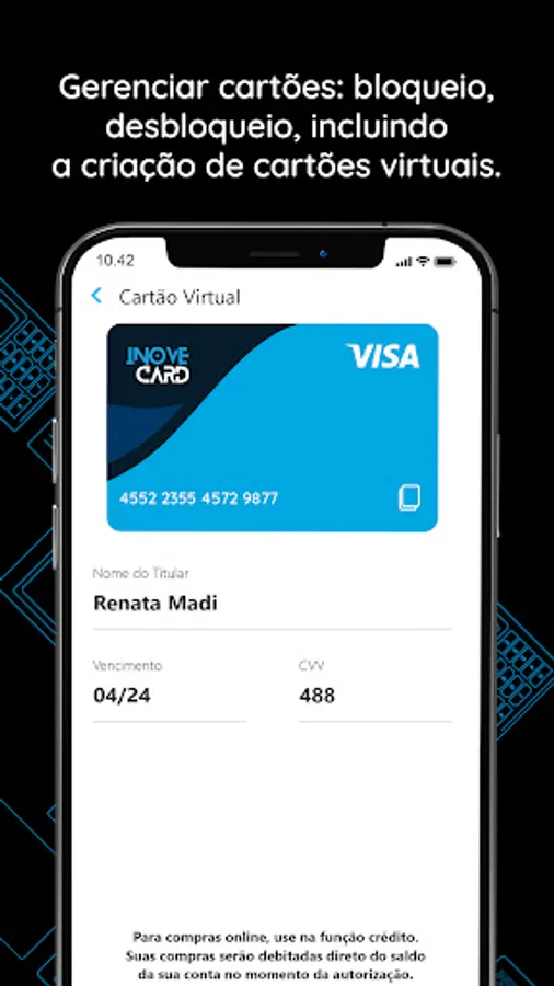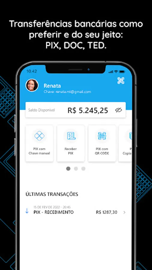Our focus is on the best experience, with fluidity and simplicity. With our app you will be able to make payments, transfers between banks, receive/send payments via PIX or QR Code, recharge your cell phone, recharge Bilhete Único, request your prepaid credit card for in-person transactions/purchases, manage cards, generate cards for online shopping and have complete management of your transactions!