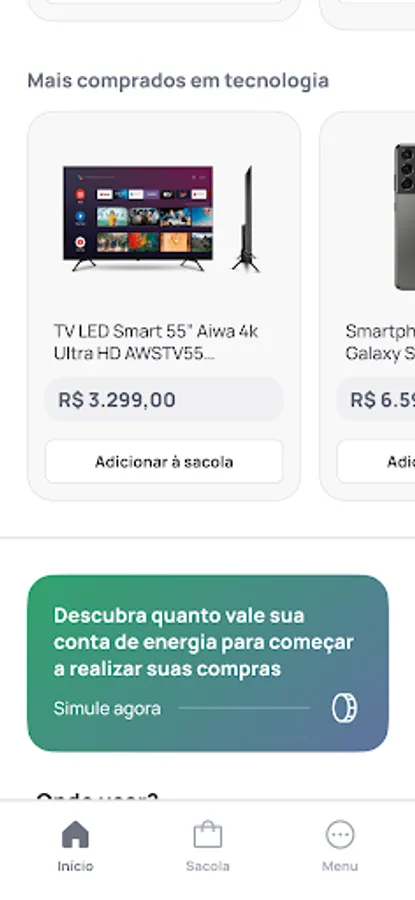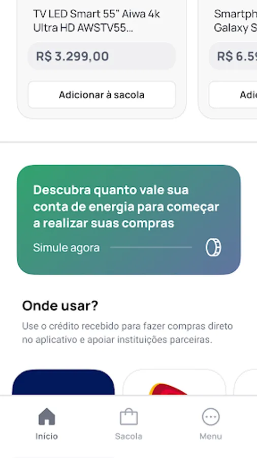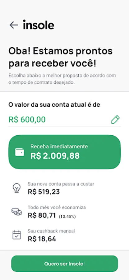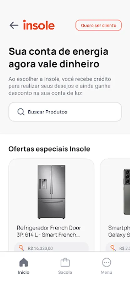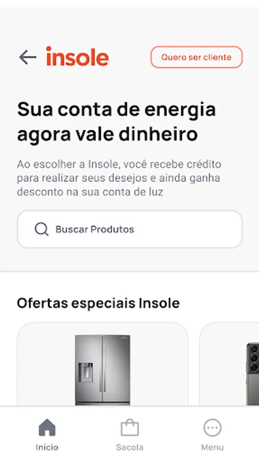 SuperApp Insole is a marketplace for making purchases using the credits received when porting your electricity bill to Insole. In addition to the credits, the user starts to pay a fixed amount and with a discount on his electricity bill, to consume clean and renewable energy and to enjoy several other advantages.