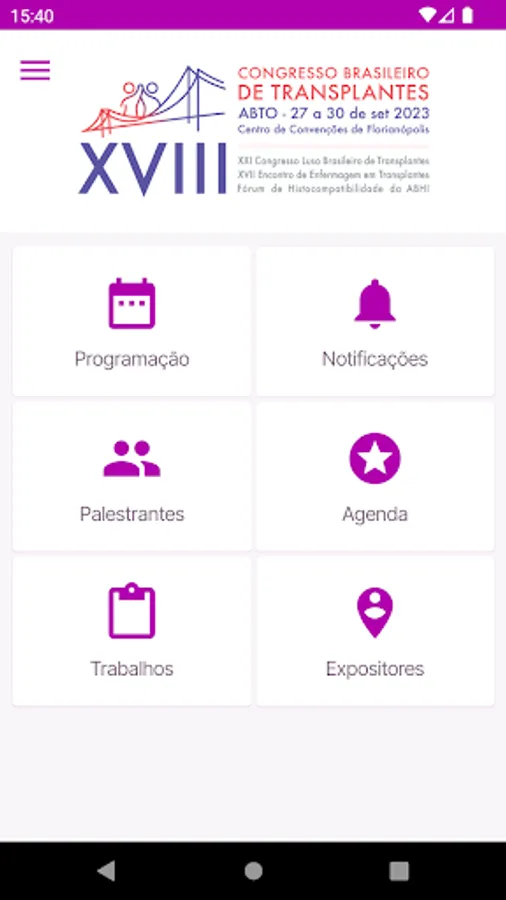Follow everything about ABTO 2023 in the app: commissions, registrations, scientific papers, speakers, scientific programming, sponsors and exhibitors, event location, accommodation and much more!