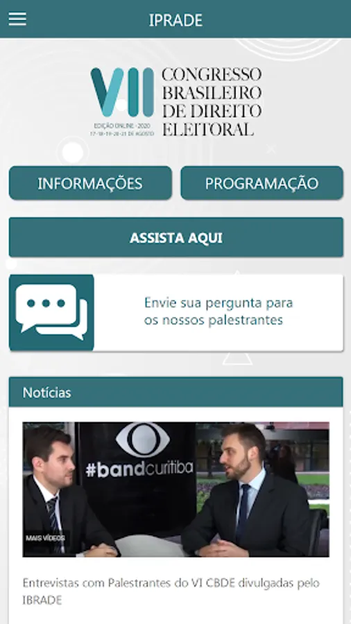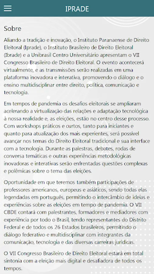 Application Paranaense Institute of Electoral Law. It allows the user to follow the top stories, important information about the Brazilian Congress on Electoral Law and come into direct contact with the institute.