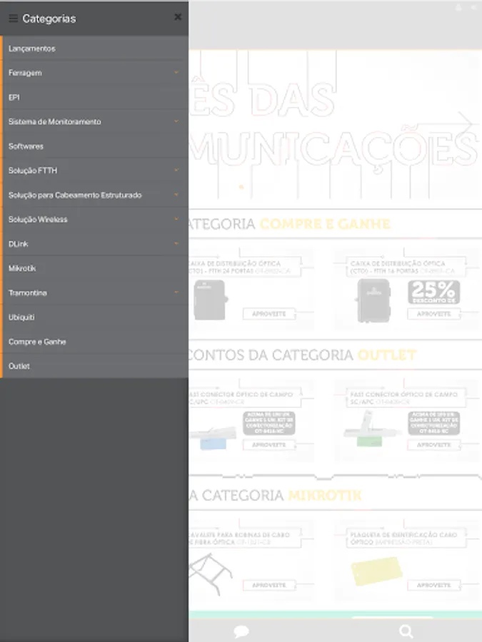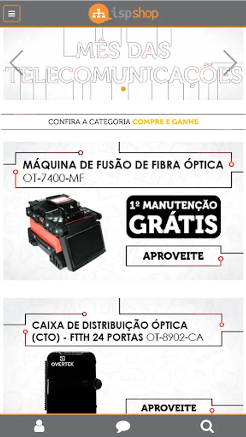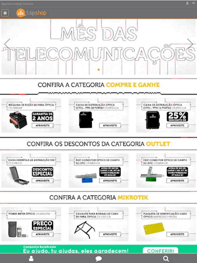 In App ISPShop you find all the products that your company needs: products for their optical networks (splice box, optical cord, splitter, fiber cable, optical drop, melting machine, FTTH solutions, OLT, UN GPON / GEPON, fast connector, DIO, etc.); products for their metal wired networks (UTP cable, cap, switch, routers, etc.); products for their wireless networks (Mikrotik, Ubiquiti, antenna, CPE, etc.); products anchor cables on poles (hardware, espinar wire support bracket BAP, insulator, etc.); PPE to protect their employees; and many other products with the quality that their networks need.