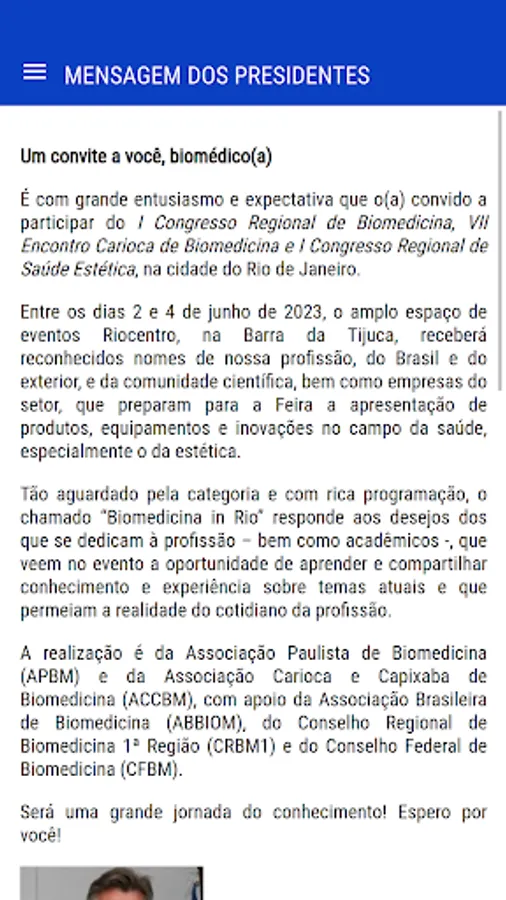 It is with great enthusiasm and expectation that I invite you to participate in the 1st Regional Congress of Biomedicine, 7th Carioca Meeting of Biomedicine and 1st Regional Congress of Aesthetic Health, in the city of Rio de Janeiro.
