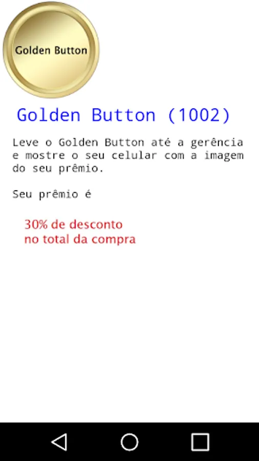 Whenever you go to a commercial point (shop, supermarket, restaurant, etc) and see on the door the notice that there is Golden Button, just activate this App to win prizes and discounts on super offers.