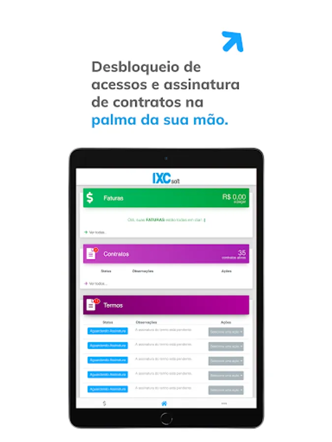 An application with exclusive features for the provider's customers, which helps in managing the financial sector. Through it, your customer consults invoices and contracts, unlocks access, opens tickets and checks their consumption. Practical, simple and efficient to assist in the consultation of pending issues.
