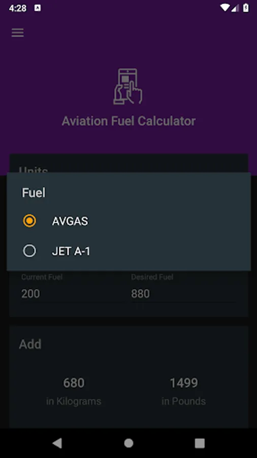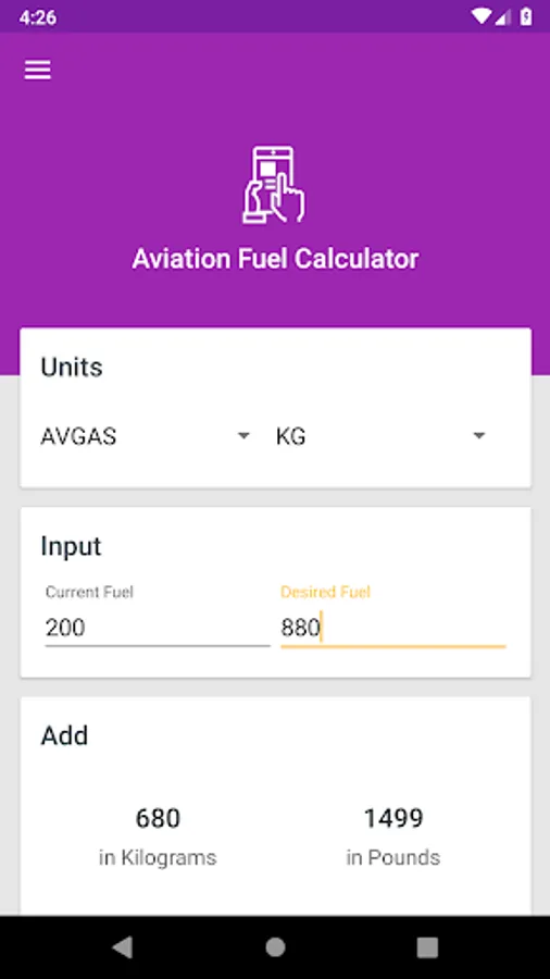 It's easy to use. Choose a fuel type and the measure used by the aircraft. Insert how much fuel you have at the moment and how much you want your aircraft to have (full tank, for example) and done. Get the needed values for refueling in all measure units.
