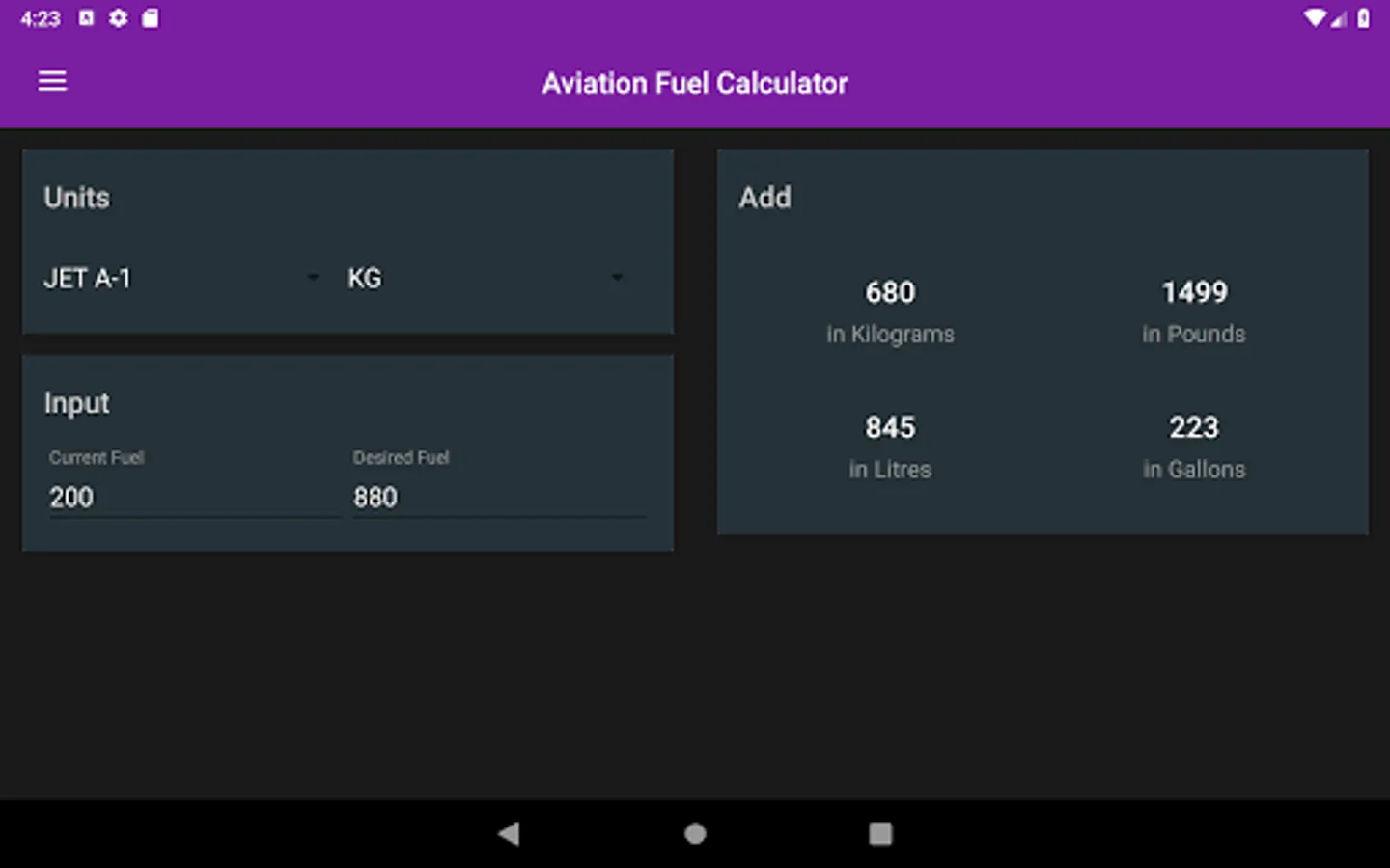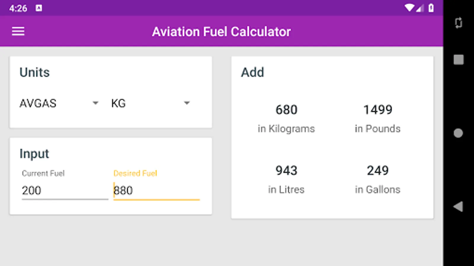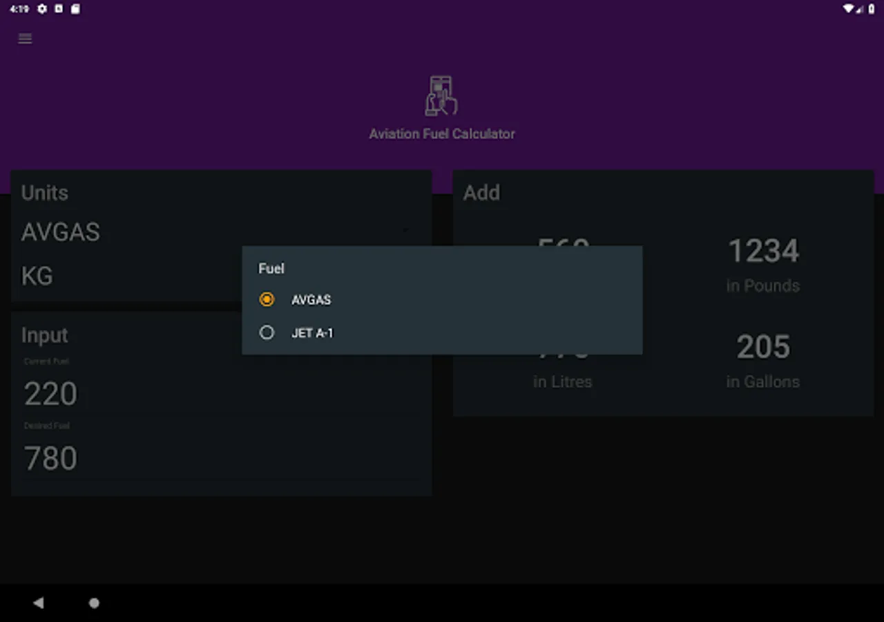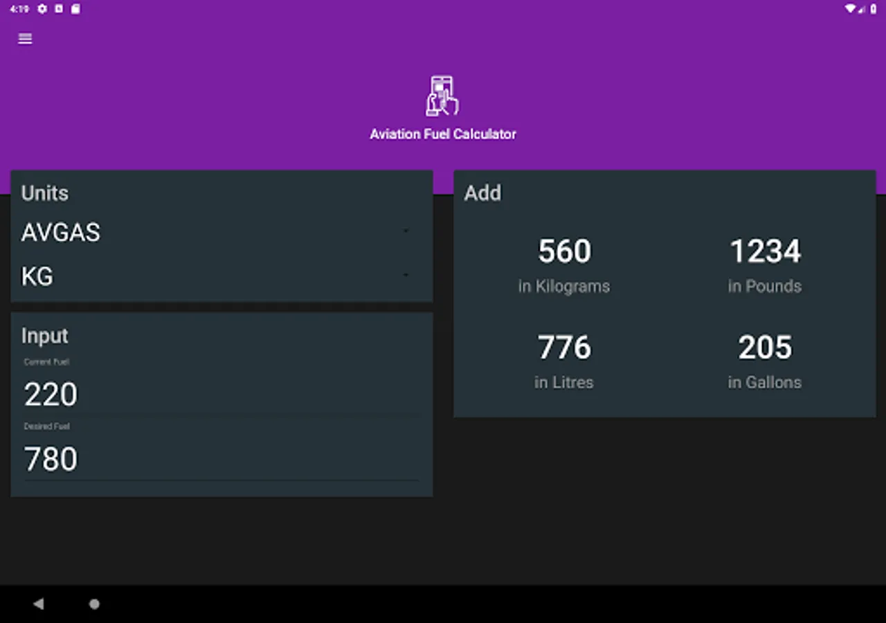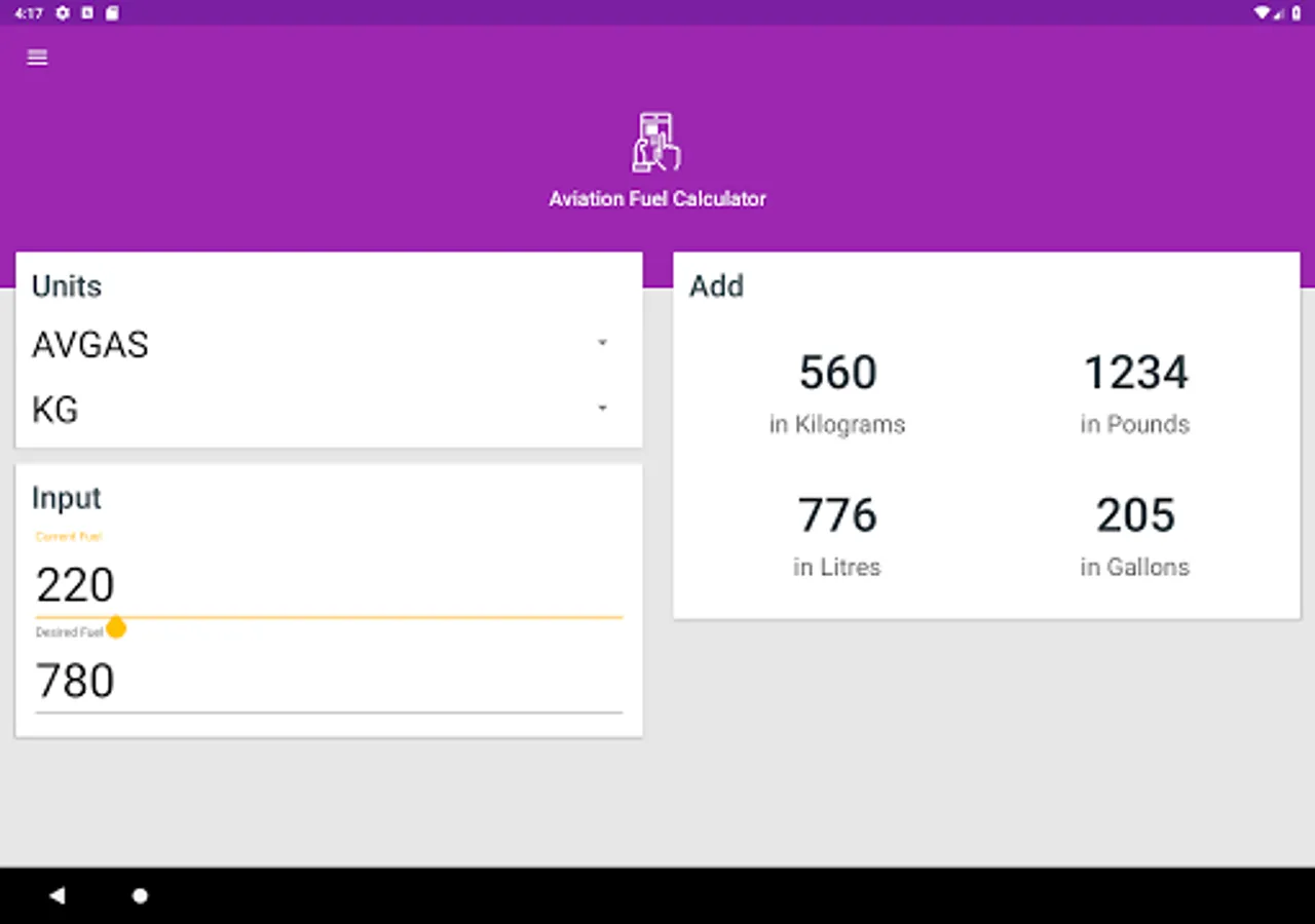 A fuel calculator for aviation. Calculate easily how much you need to refuel in kilograms, pounds, litres or gallons.