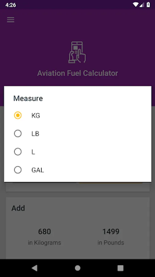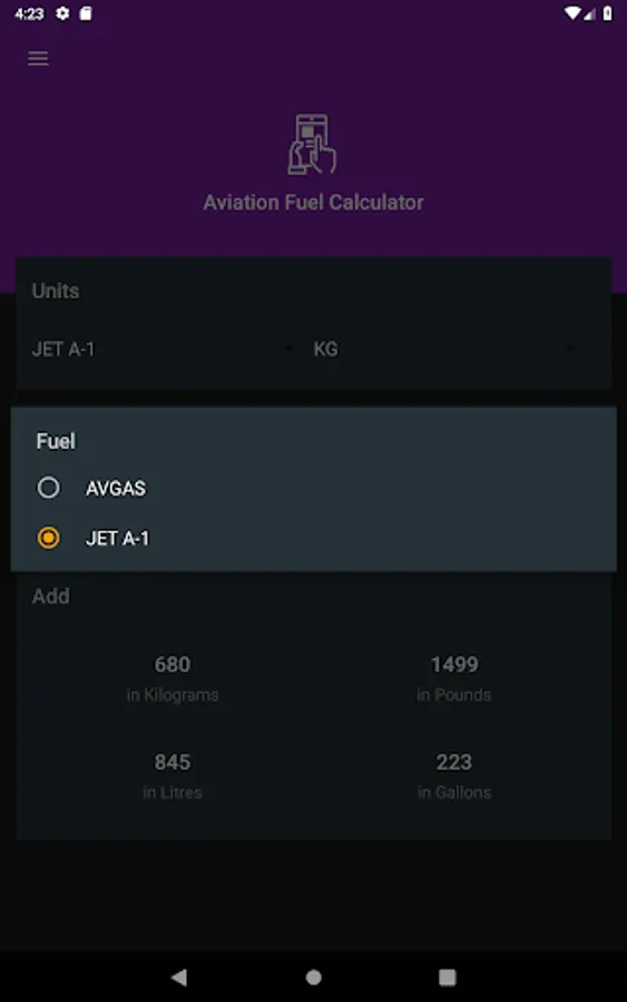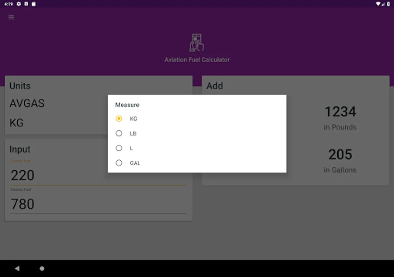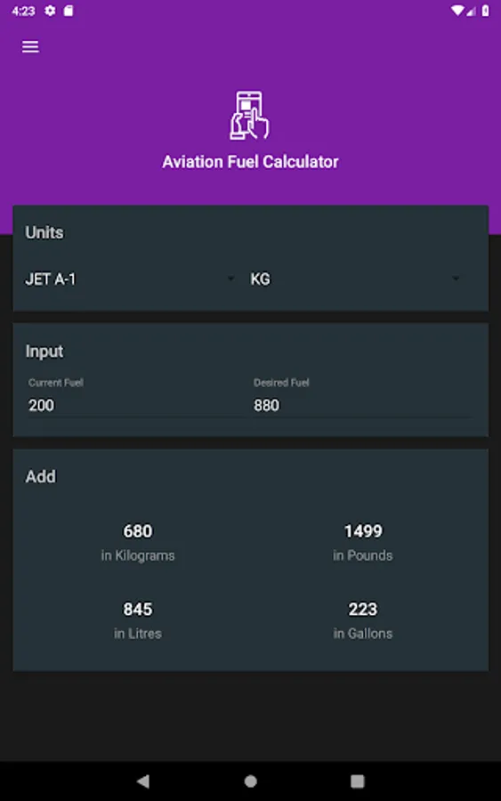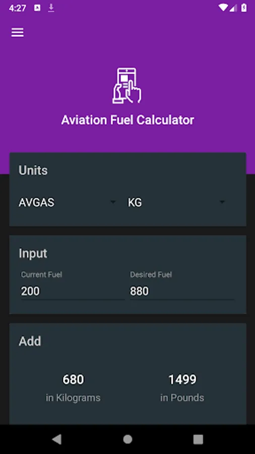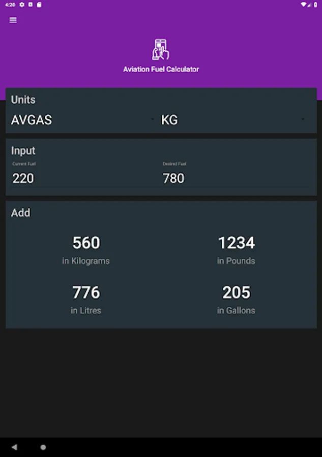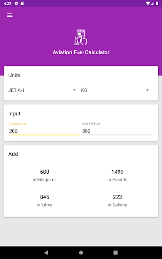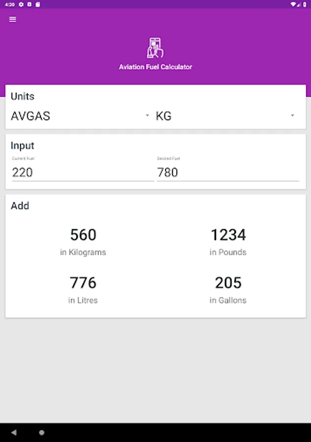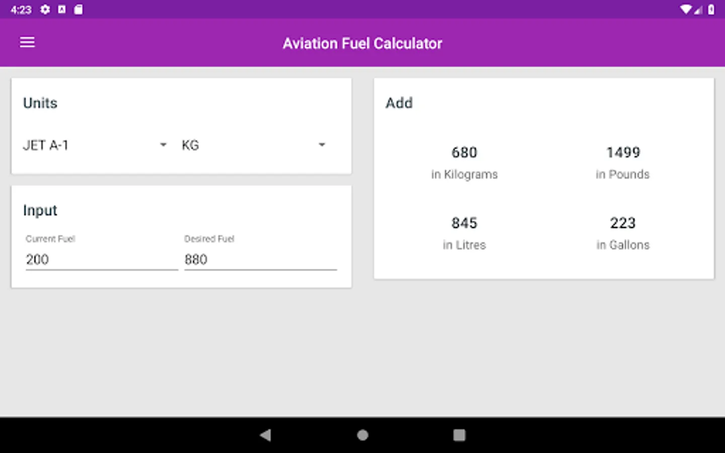 A fuel calculator for aviation. Calculate easily how much you need to refuel in kilograms, pounds, litres or gallons.