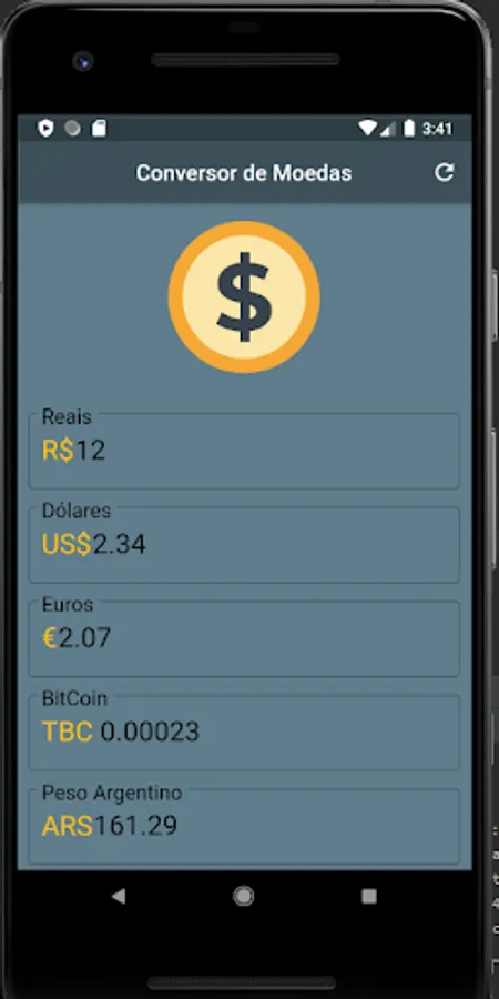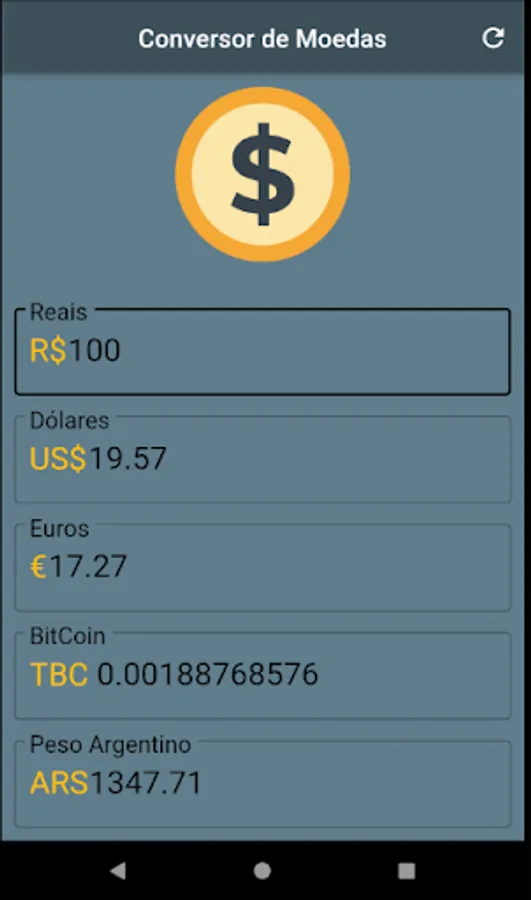 Converted currencies: Real, Dollar, Euro, Bitcoin, Argentine Peso, among others.