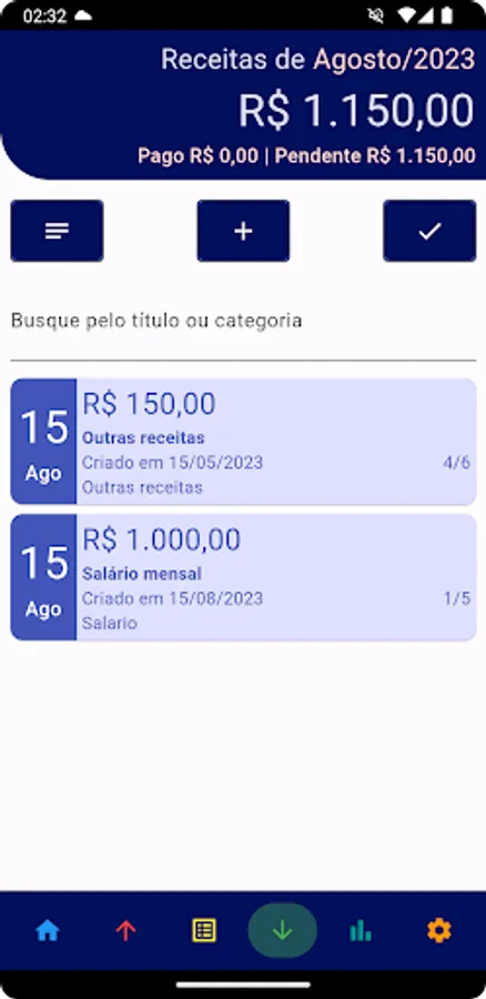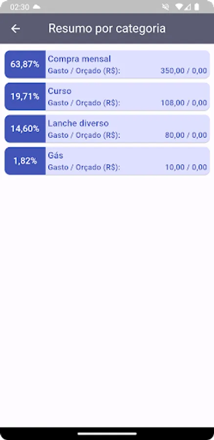 - On the screens listing expenses and income, it is possible to access the Category Summary screen that lists the entries of the selected competence, grouping the values by Category, giving the end user a more general notion about the characteristics of their financial behavior.