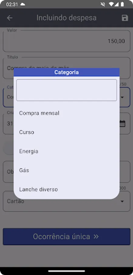- Form for recording expenses. It is possible to indicate a title, category, creation and expiration dates, note, status (paid or pending), card, notes, and also multiple occurrences/repetitions (such as purchases in installments).