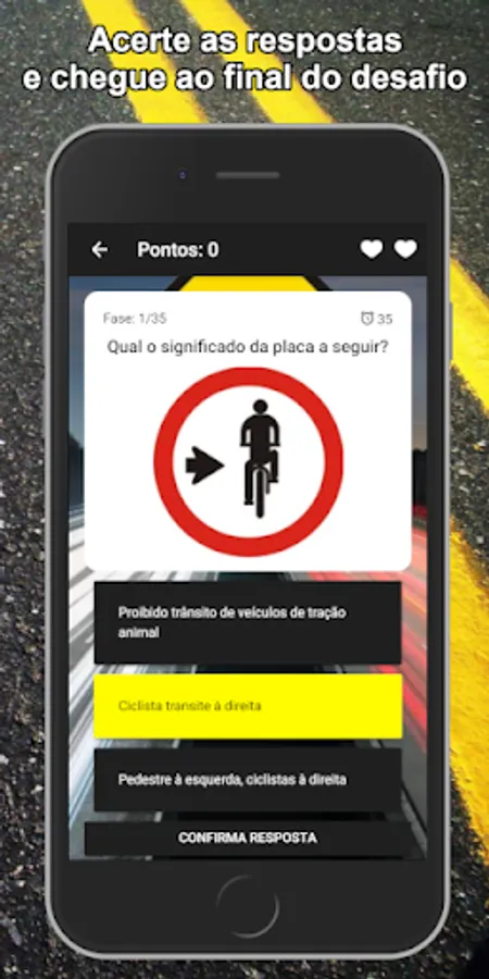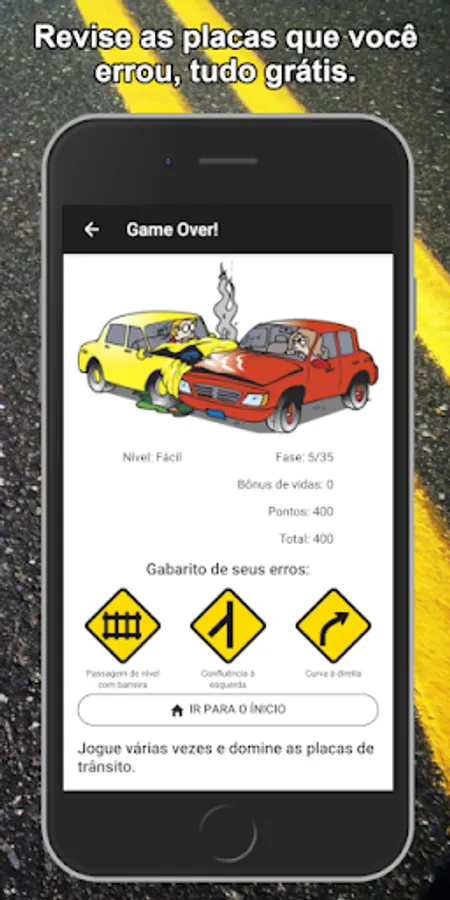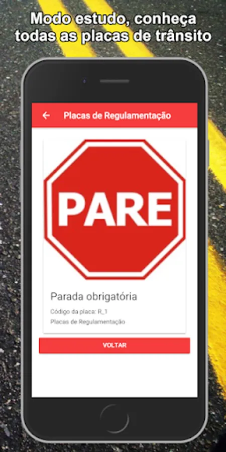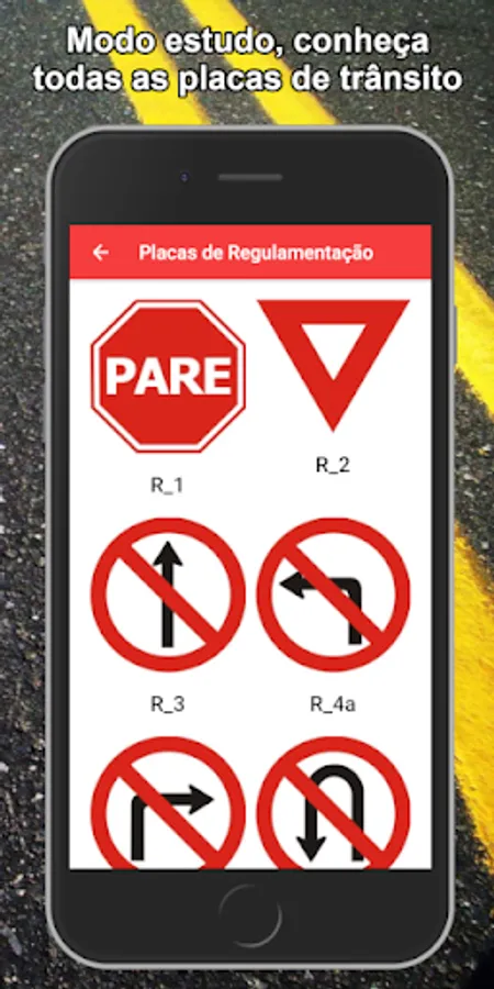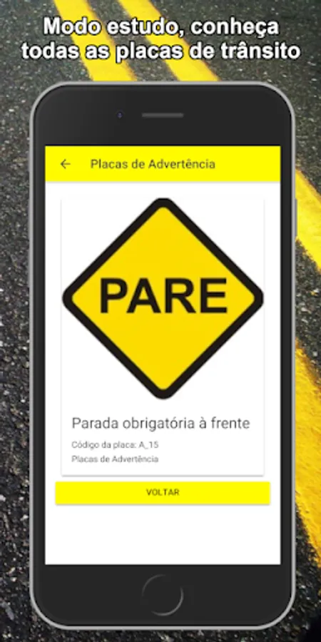 The game also has the study mode where good quality images of the main traffic signs are provided in addition to the meaning and the reference code of each one.