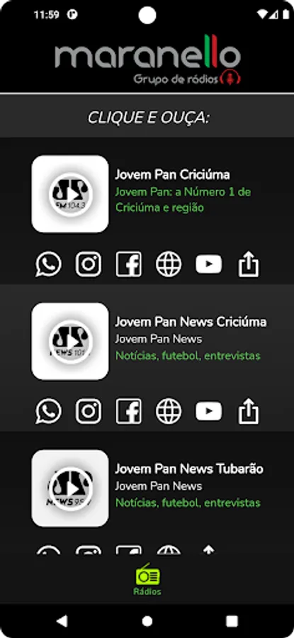 In the Jovem Pan Criciúma application you have access to three radios: Jovem Pan News Criciúma, Jovem Pan FM Criciúma and Jovem Pan News Tubarão.