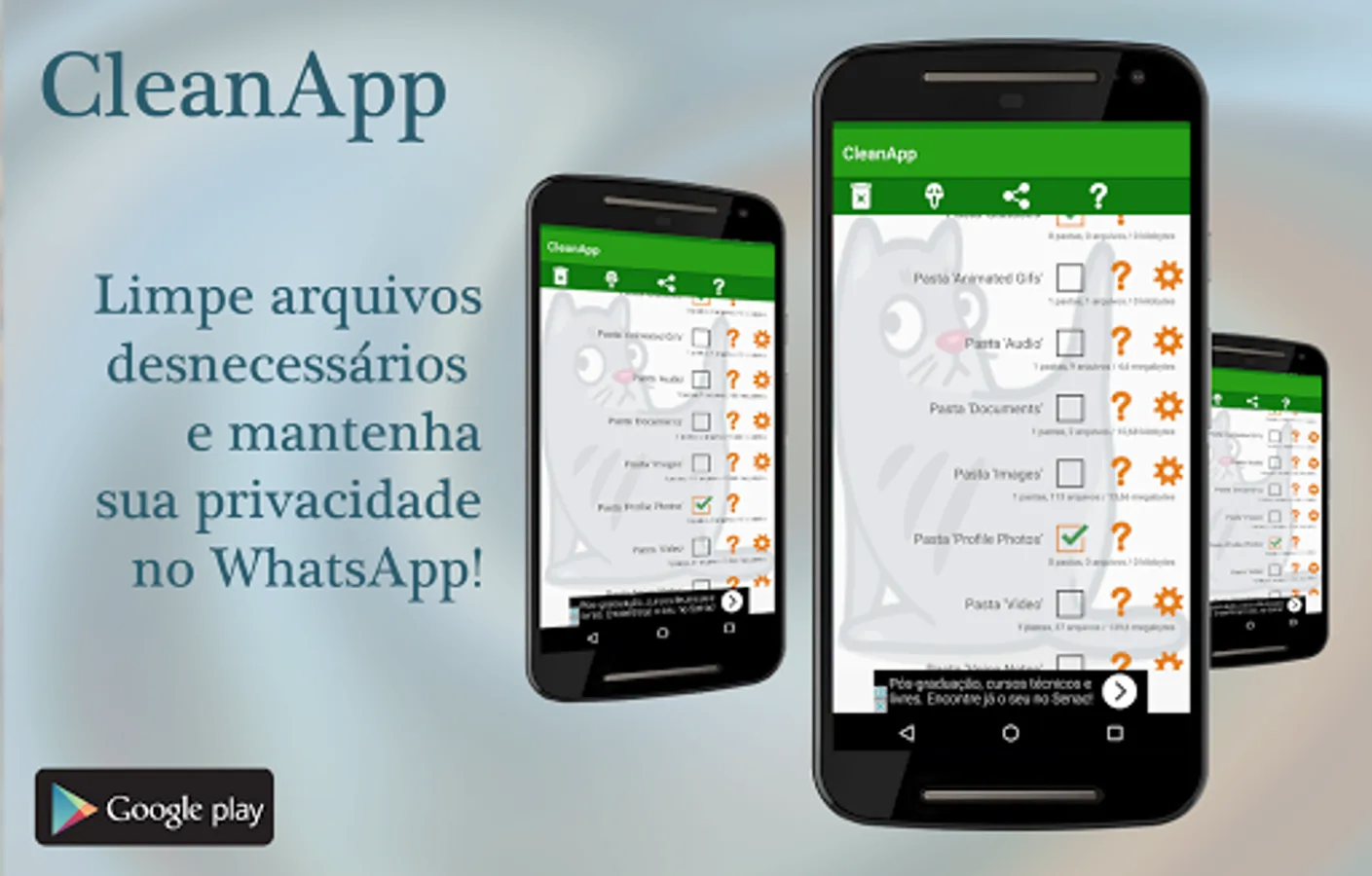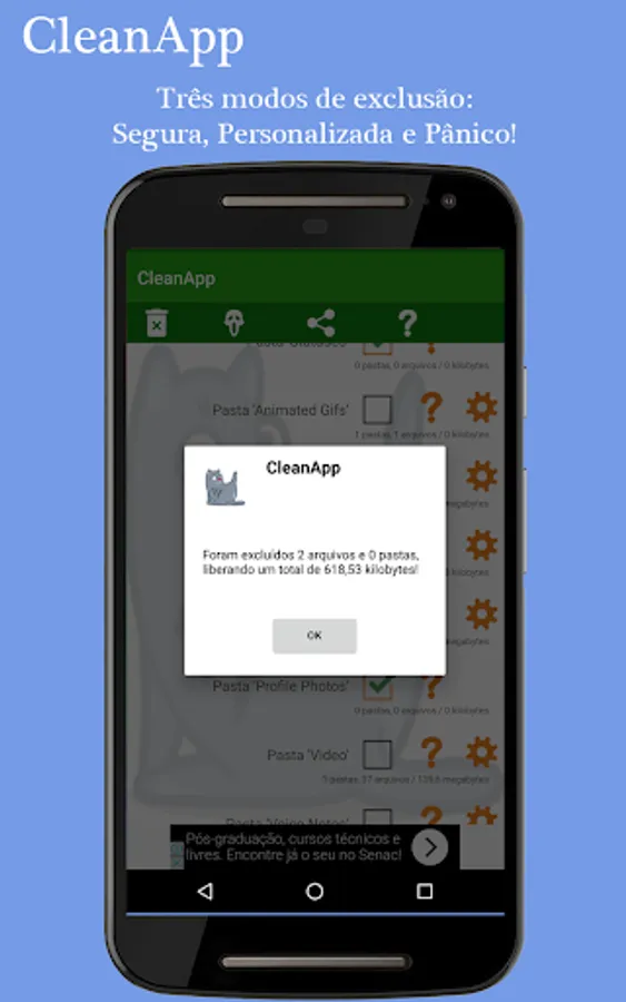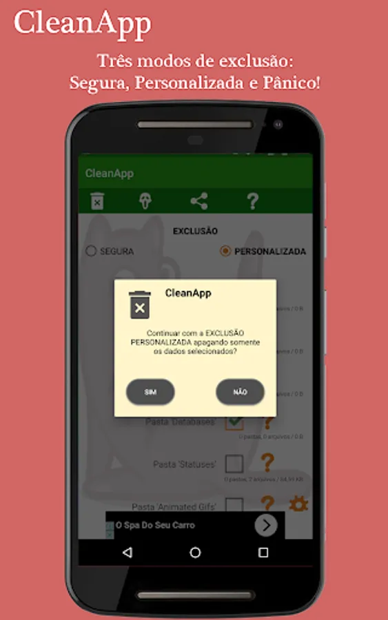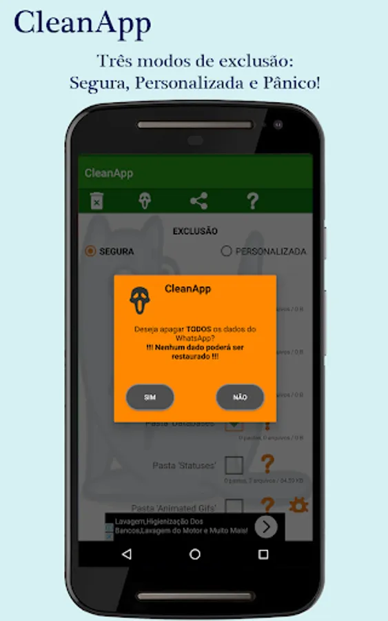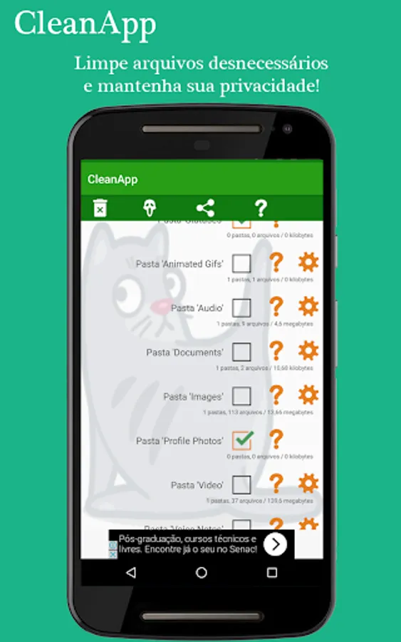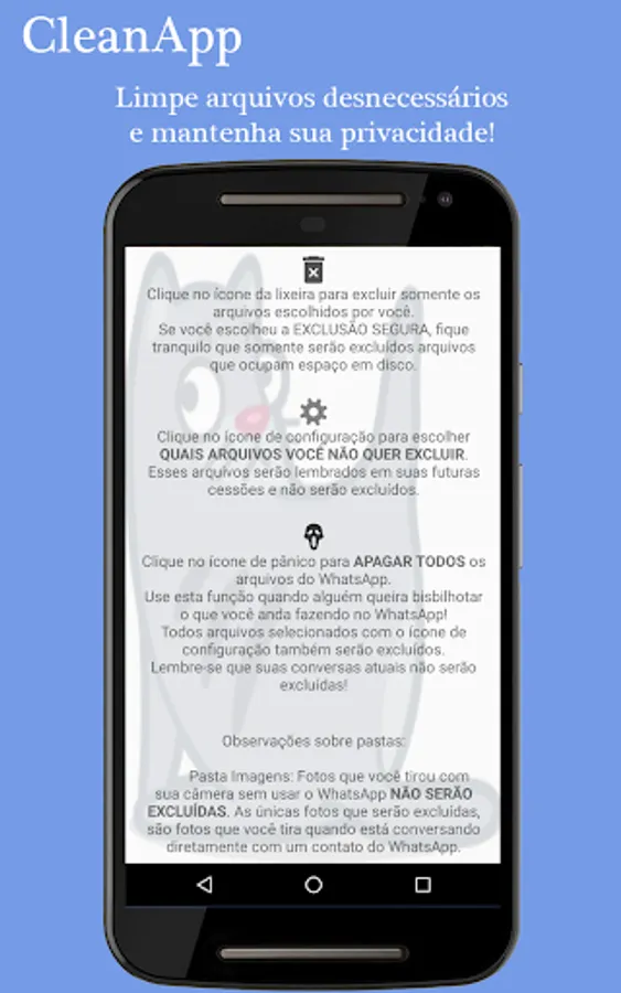 With this app you can define which folders and files you want to delete from WhatsApp, freeing up disk space, processing and maintaining your privacy.