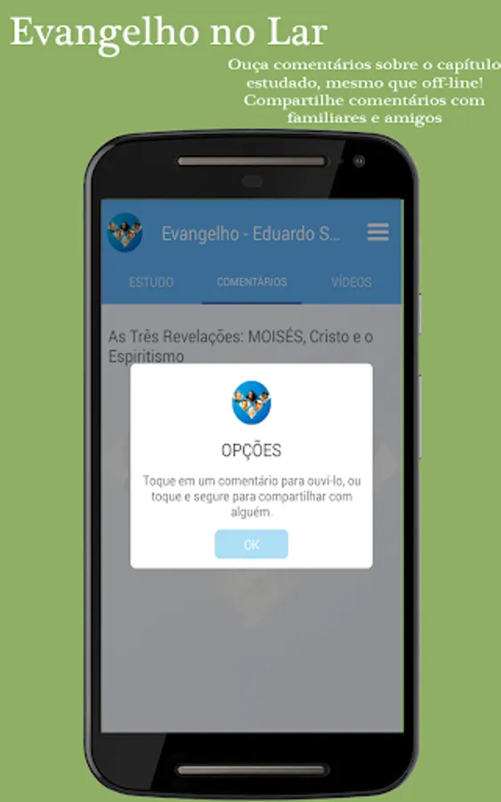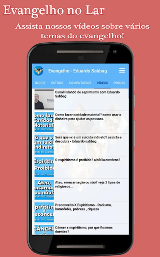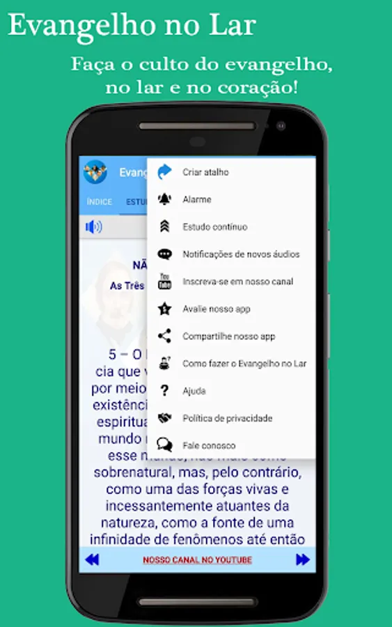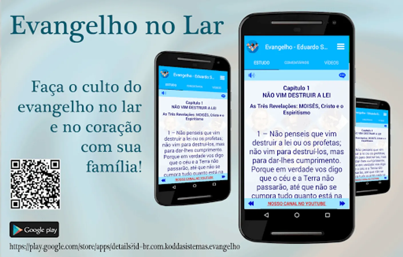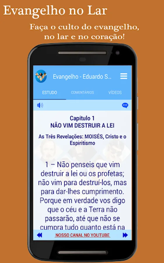 Tatiana Murari's reading of the Gospel, and audio commentaries by members of the spiritist group: Eduardo Sabbag, Felipe Saad, Leonardo Torres and Juliano Guterrez.