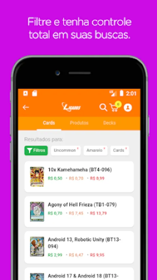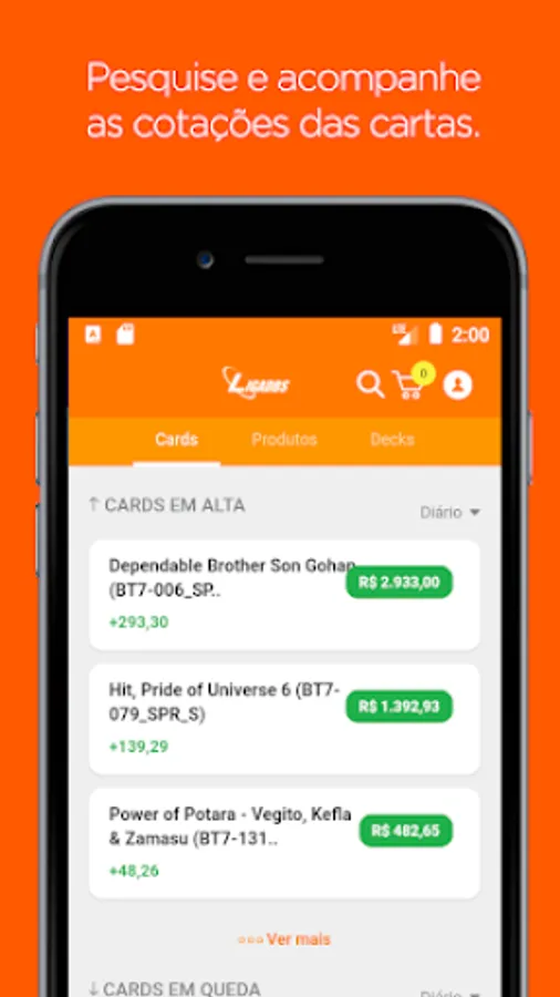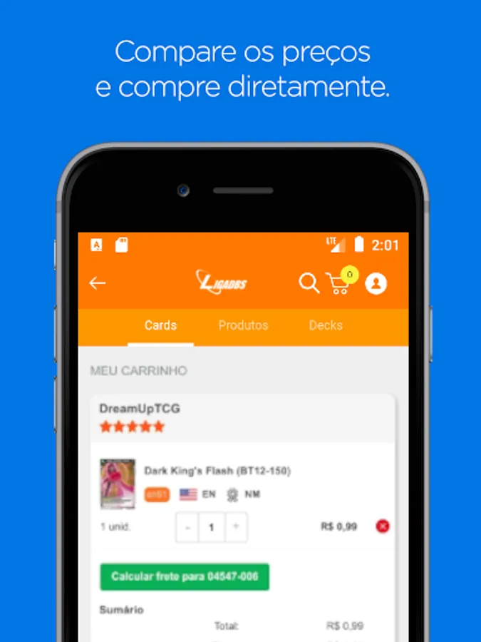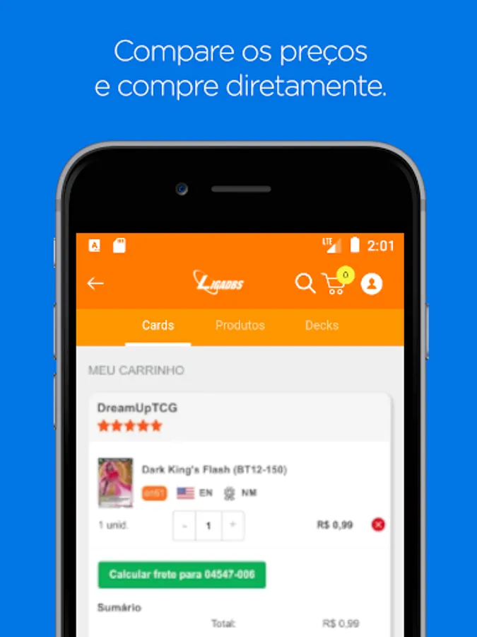 In the LigaDBS App you will have the price increases and decreases of the DBS cards and buy them in many stores at once. In addition, you will have the security of payment via LigaSegura to ensure that your purchase is successful.