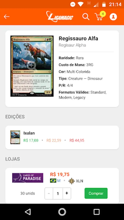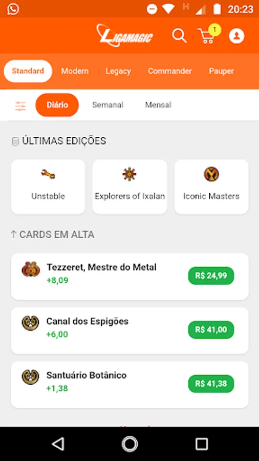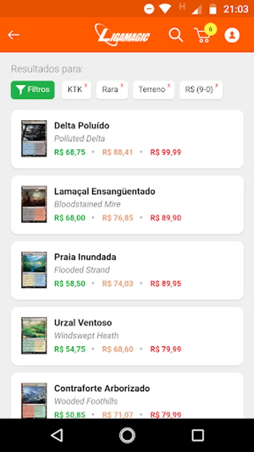 In App LigaMagic you will have the ups and the cards price declines in several formats (Standard, Modern, Legacy, and Commander Pauper) and buy them in many stores at once. Also will have the security of payment via LigaSegura to ensure the success of your purchase is guaranteed.