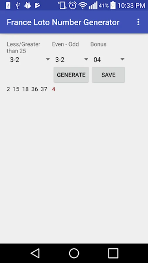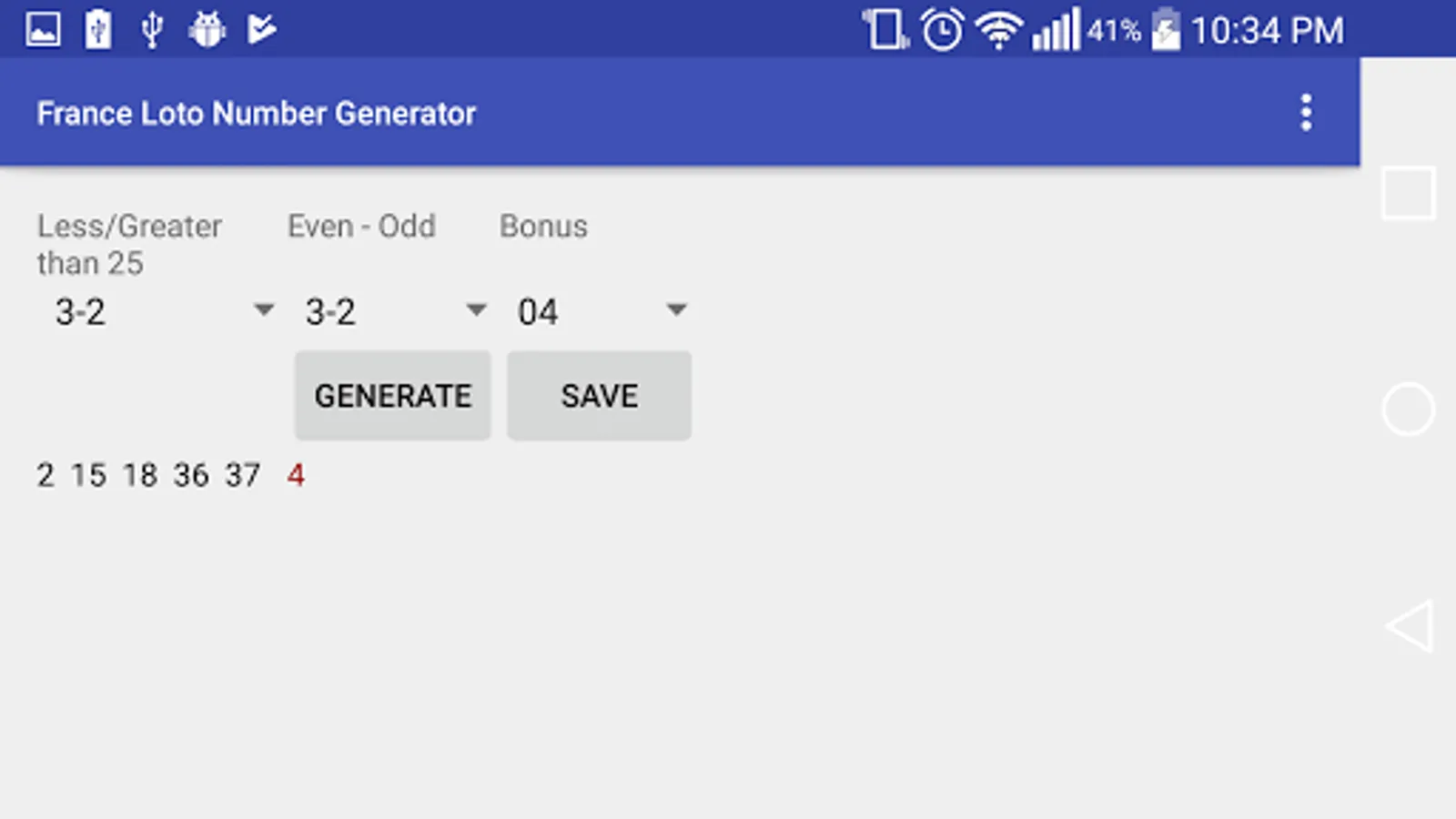 The app provides the generation of numbers to France Lottery according to user's choice about even / odd numbers and greater or less than 25 numbers