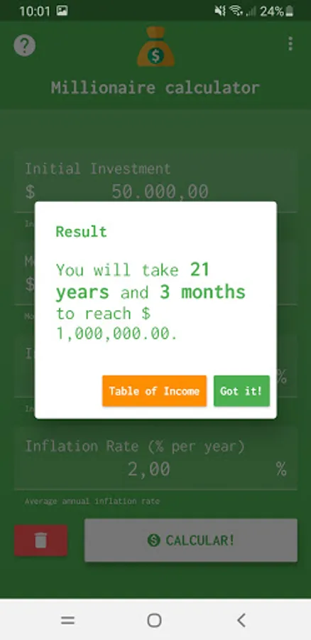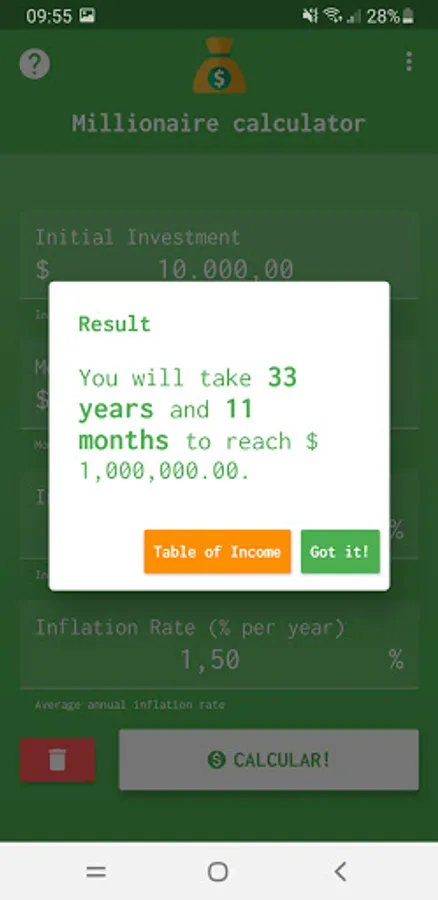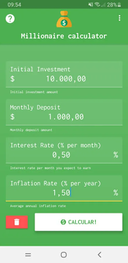 The calculator works in a very simple way. Just enter the initial investment, the deposit value that will be contributed monthly, the monthly interest and inflation. At the end of the calculation, the number of years and months until you reach the amount of one million will be displayed.