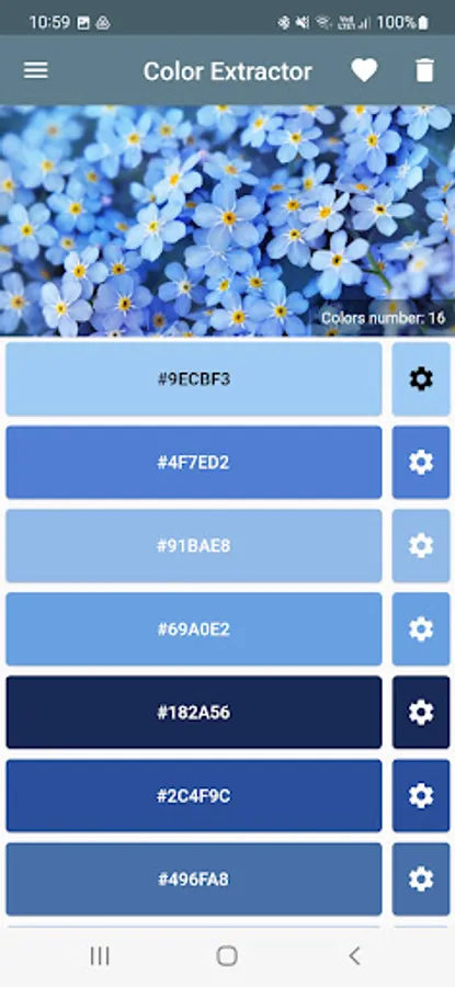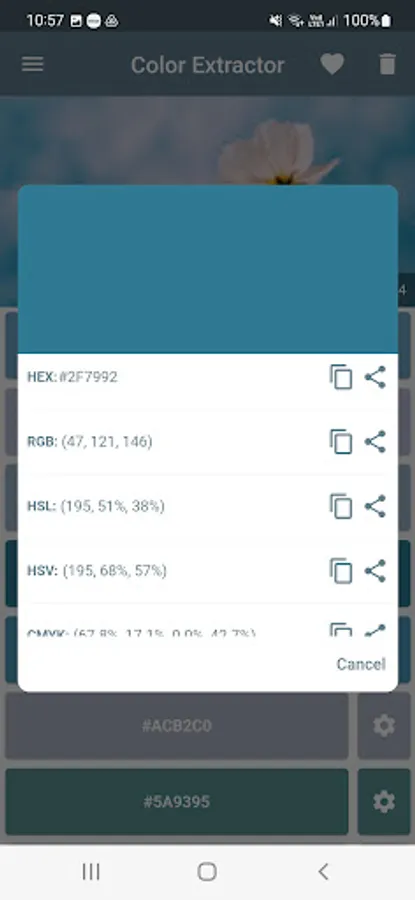The app Colors Extractor helps you to extract colors from any image. The colors are shown with yours hexadecimal code and can be copy to clipboard. Furthemore, the colors code also are exposed in the colors sistems like RGB, HSV, HSB and CMYK.