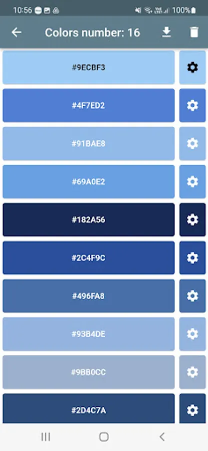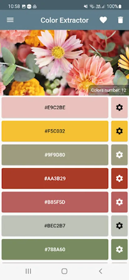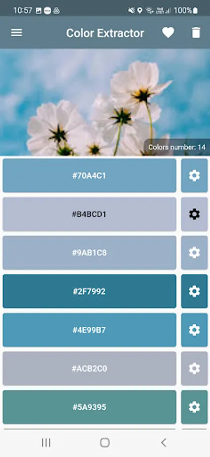 To extract colors using the app is very simple. Just import the images from the device gallery, from a URL(Internet link) or through the camera. In this way, the application will display the main colors that make up the image. In addition, it is possible to add the color palette to the favorites list and export an image with the found color collection.
