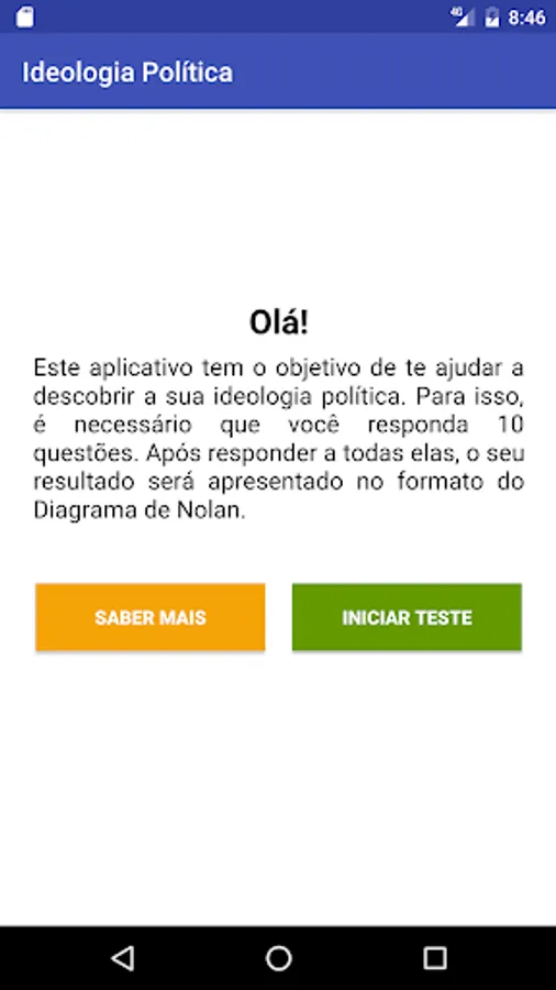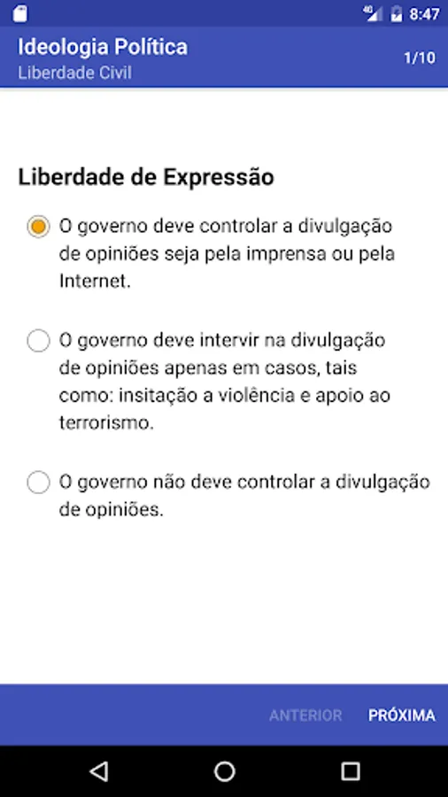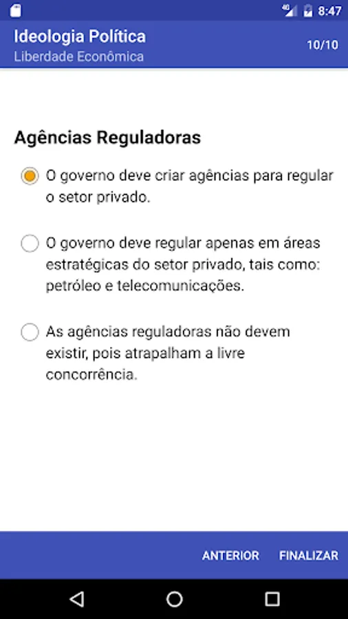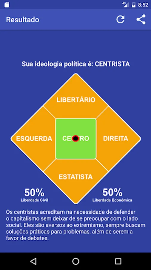To discover his political thought, this app uses a questionnaire with 10 questions. Each question has three alternatives. The first five questions relate to civil liberties. Already the last 5 questions are related to economic issues. After all they be answered as a result, it generates a diagram known as the Nolan Chart.