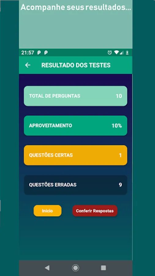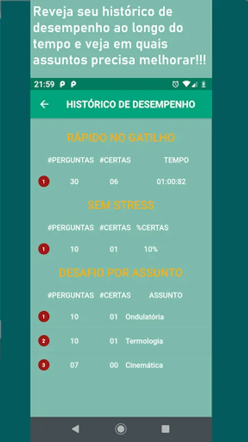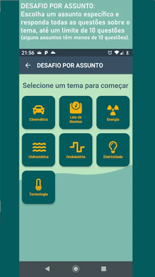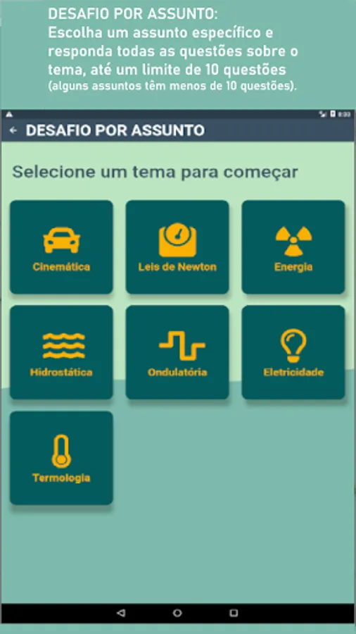 CHALLENGE BY SUBJECT - In this mode you choose the subject and answer 10 questions on the topic or all the existing ones (if the subject has less than 10 questions, which occurs in some situations).