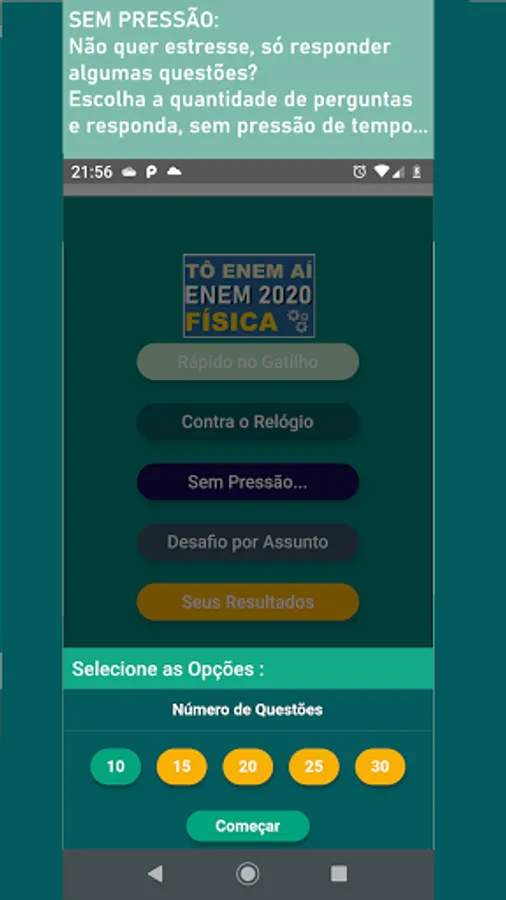 NO PRESSURE - When you don't want any stress with the stopwatch, select this option, and the number of questions, which will be generated randomly among all those available in the app.