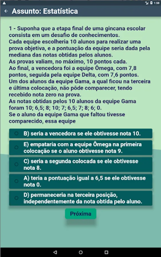 The alternatives contain the letter of the question, but are always presented in random order, so that you are not conditioned by the order of the alternatives and focus on the right answer.