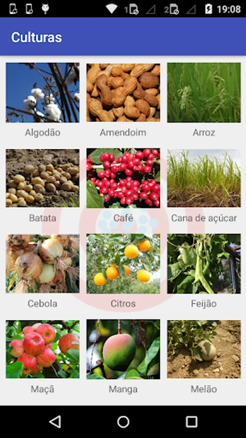 The PontaCerta makes recommendations to the 15 main crops in Brazil: cotton, peanuts, rice, potatoes, coffee, sugarcane, onion, citrus, beans, mango, apple, melon, corn, soybeans and tomatoes.