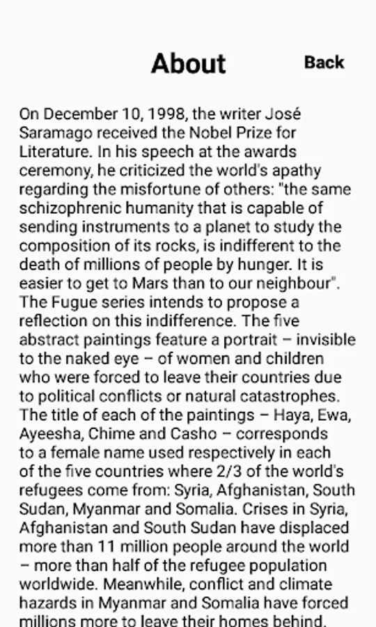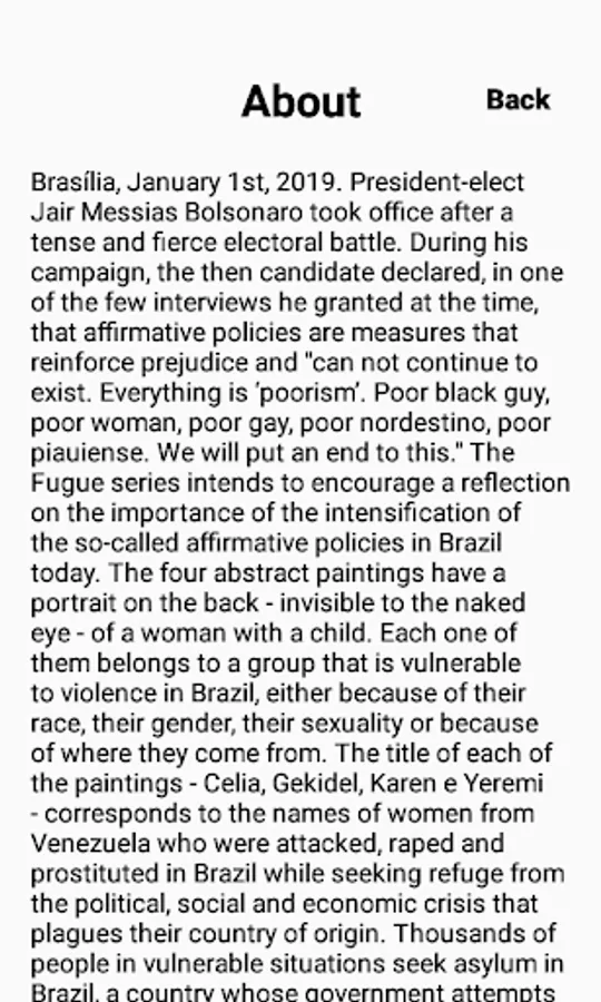 Experience augmented reality through images of abstract paintings that hide portraits invisible to the naked eye. Some of them were made from photographs of women forced to leave their countries due to political conflicts or natural catastrophes, others from images of members of the groups most likely to become victims of violence in Brazil.