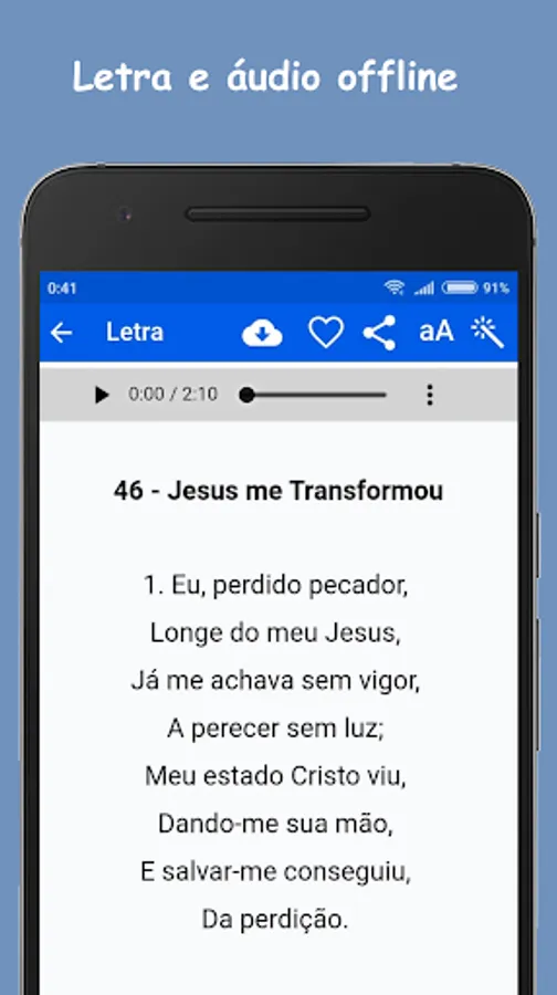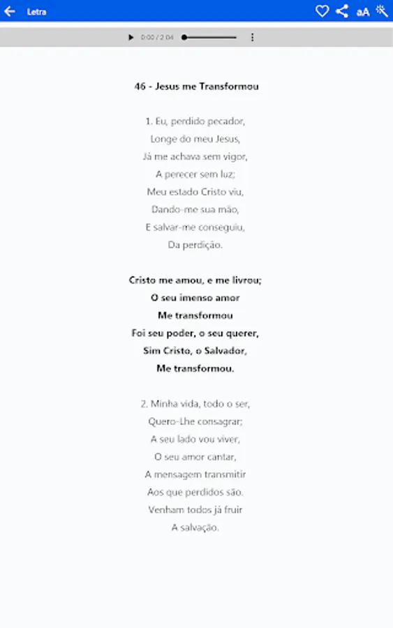 Altogether there are 581 hymns by the Christian singer, encrypted and with audio , which is the hymnbook used by the Baptist church. The best application of Christian singer with score with the possibility to download the hymn of the Baptist Christian singer to listen offline .