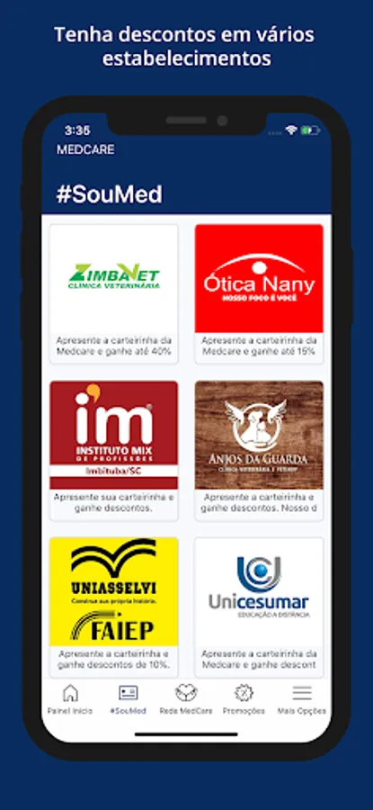 With this application, the Medcare member can consult the entire network of benefits to which he is entitled. With the Medcare Card, the member has exclusive discounts in the area of health, education, well-being and much more.