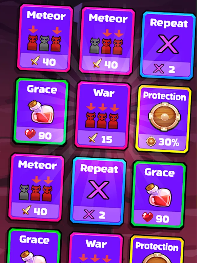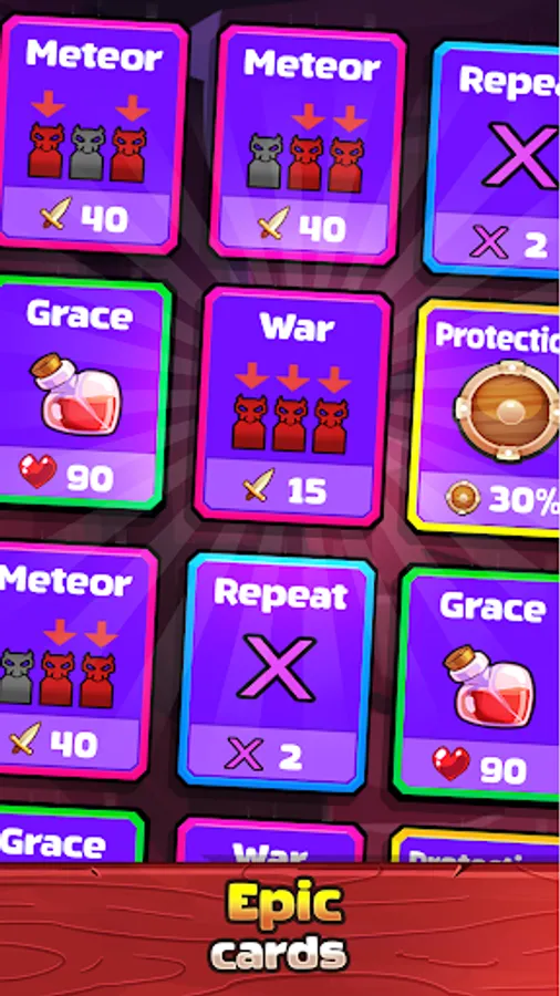 Choose and play wisely your hand of cards, between defense, attack and heal. Pay attention to the enemy’s life and damage, to know exactly when to attack. But, don’t worry if you die, you can learn with that to reach higher levels next time! Knock the enemy down to conquer the tower’s floor, and you might reach the top of the tower!