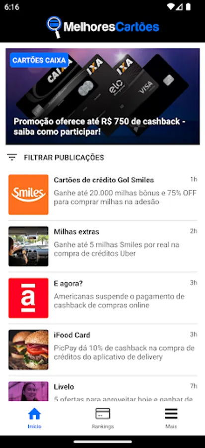 Melhores Cartão was born for this: to help you enjoy the best in the world of credit cards, miles, points, digital accounts and cashback. Here you will stay on top of all promotions and news. You will be alerted of harmful changes and the release of new cards and interesting programs!