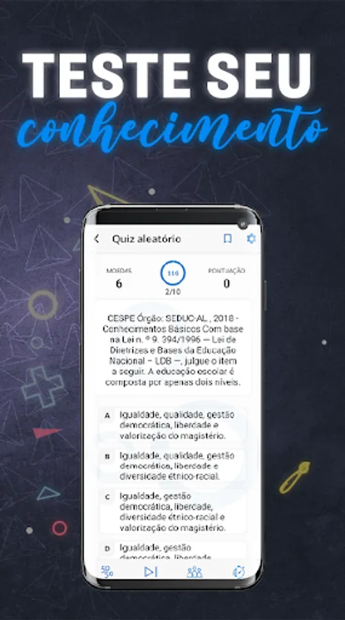 This is the ideal modality to refine your knowledge on the eve of tests. Challenge yourself in exams with specific themes, where you select how many questions you want to answer and what time is available.