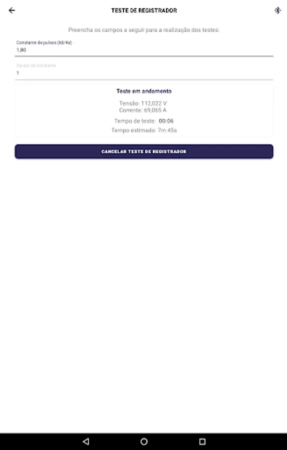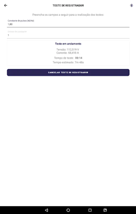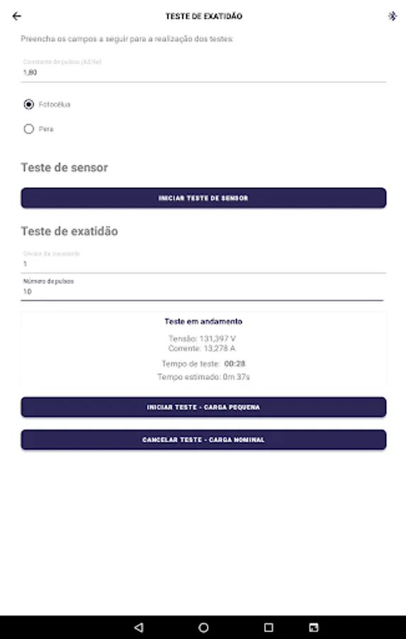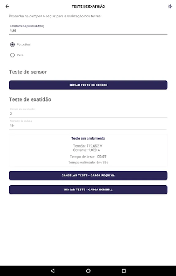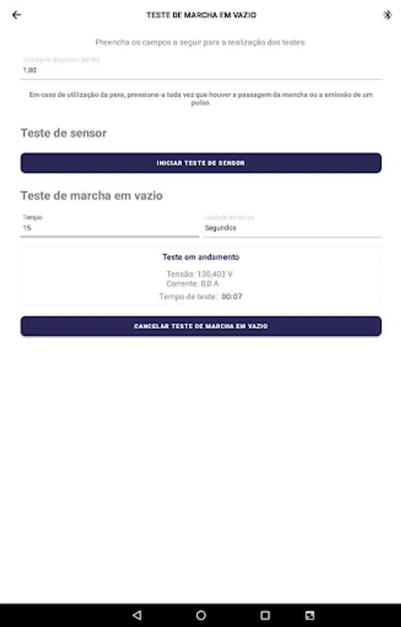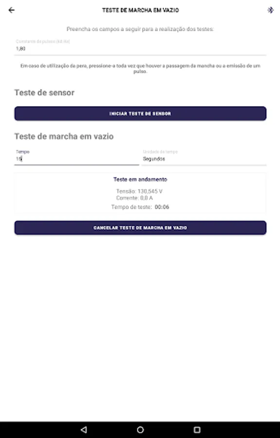 The interface of the equipment with the user is through this application, which communicates via Bluetooth with the "Single-phase Calibrator - IDF", performing the tests configured by the user.