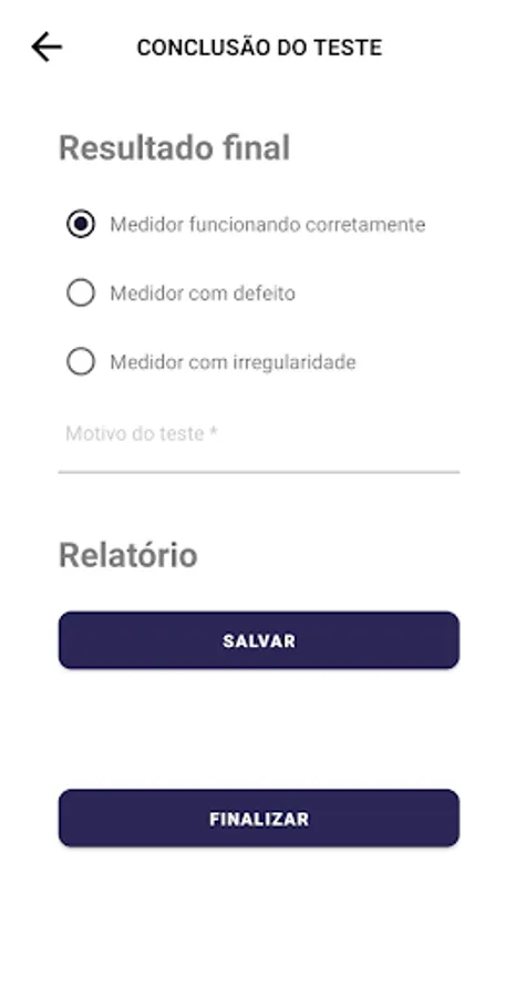 The application allows the registration of meters, in a local database, as well as registration of users, who have two levels of permission. In addition, it is also possible to register more than one device, in order to use the same application to run tests with different devices.