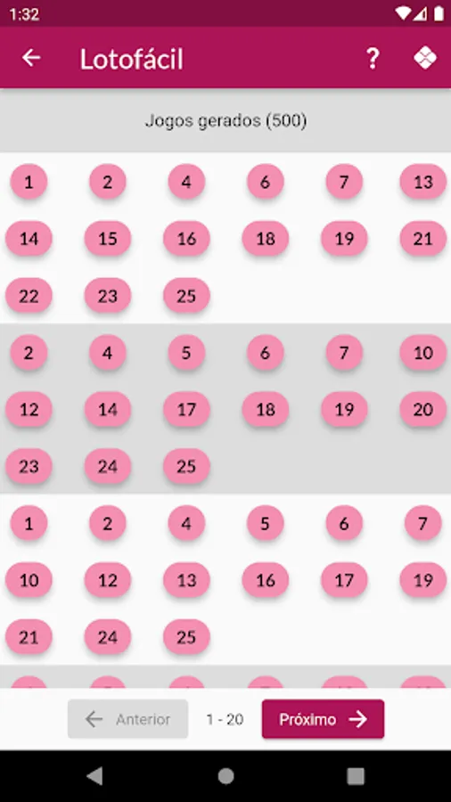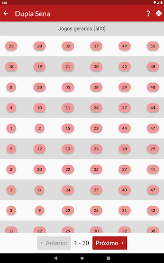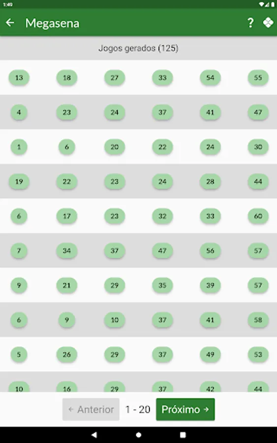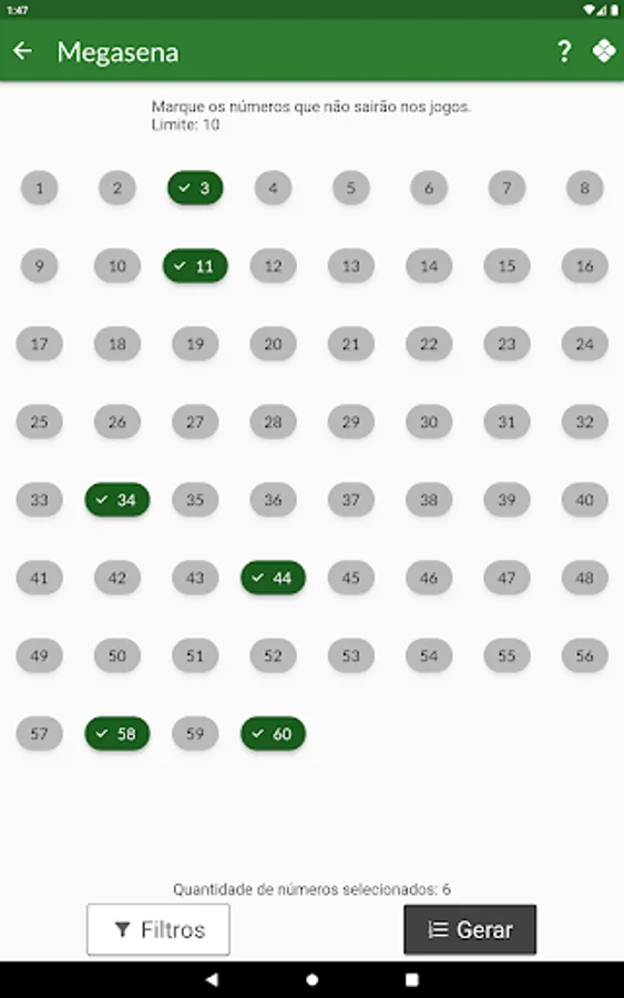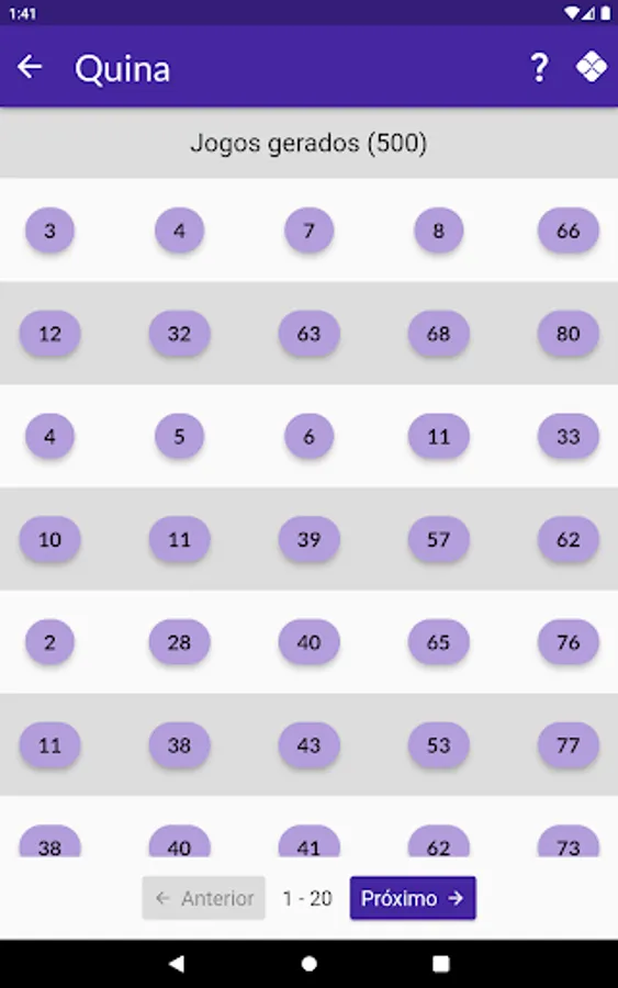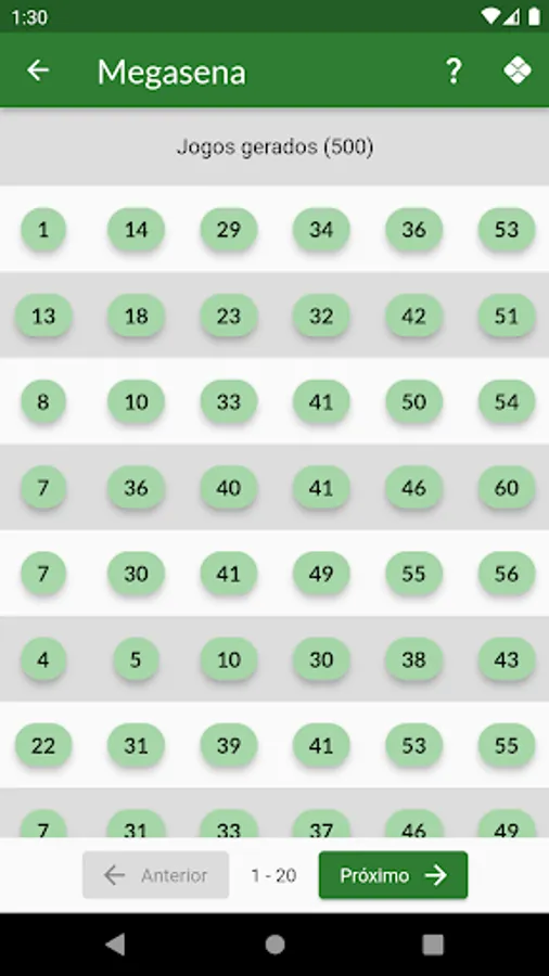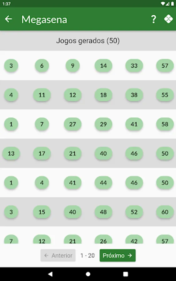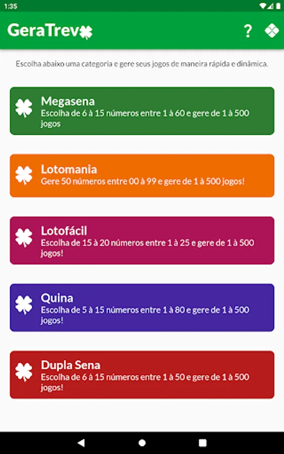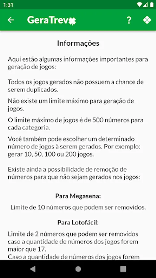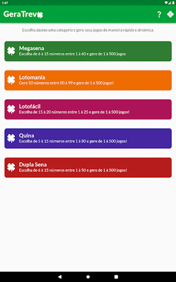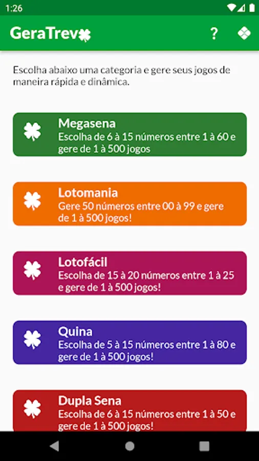 Currently this version includes generation of games for Megasena, Lotomania, Lotofácil, Quina and Dupla Sena.