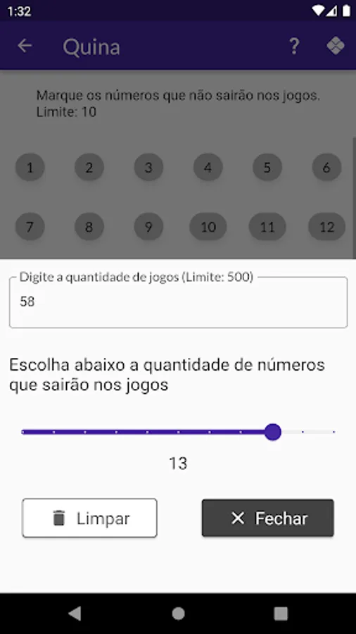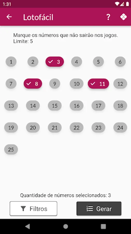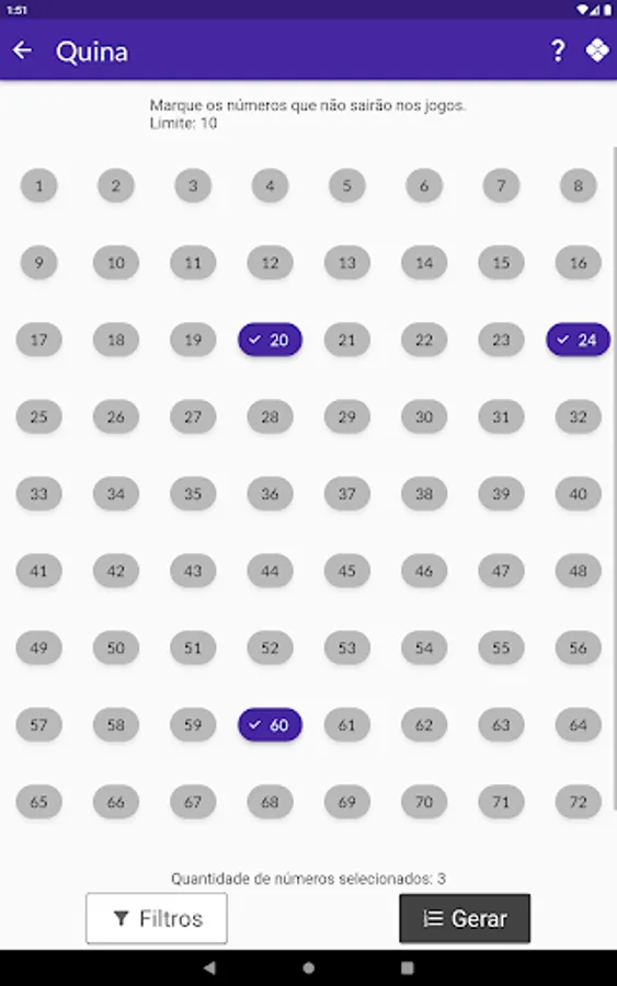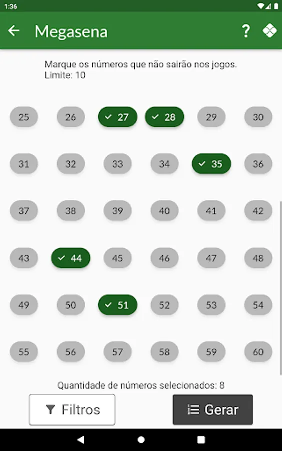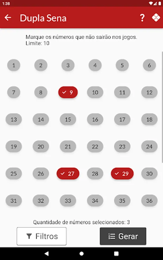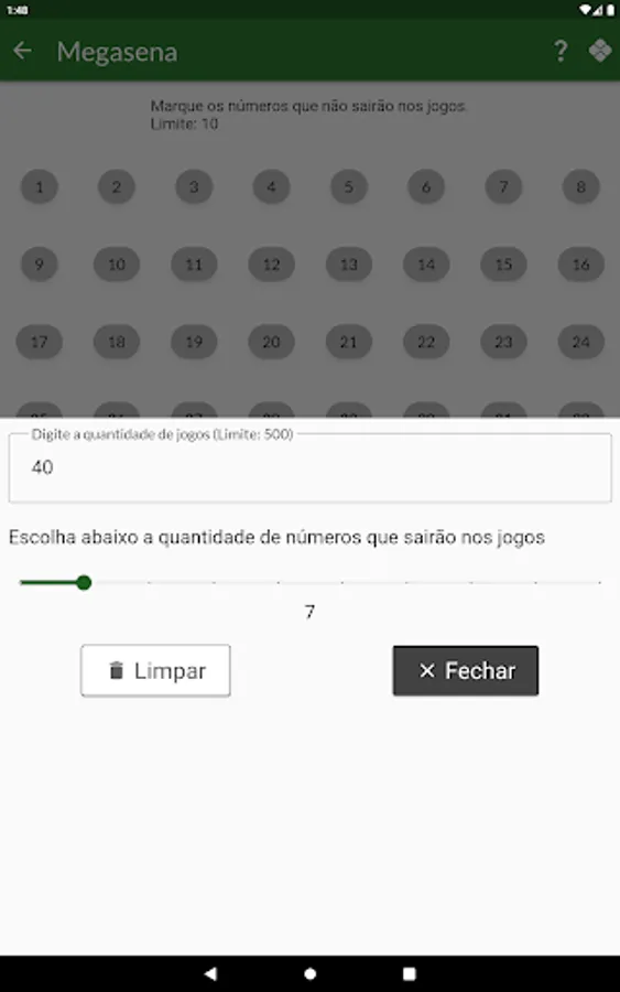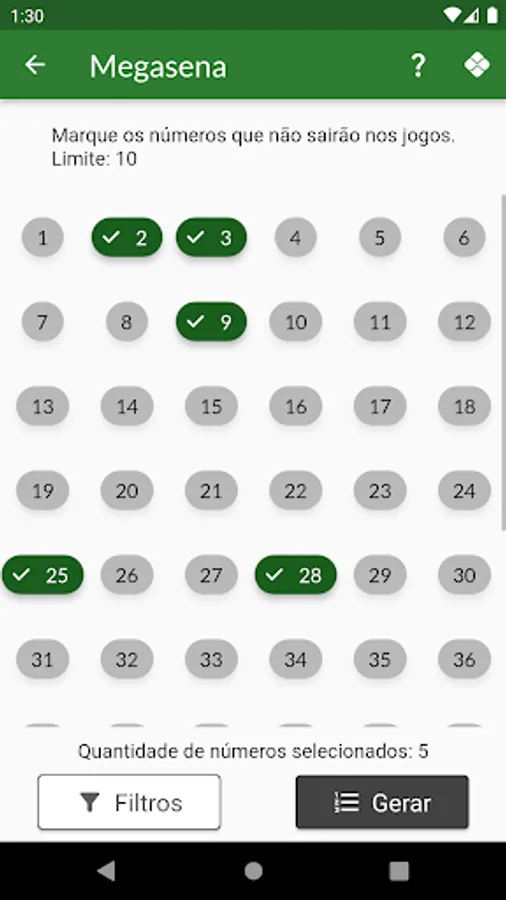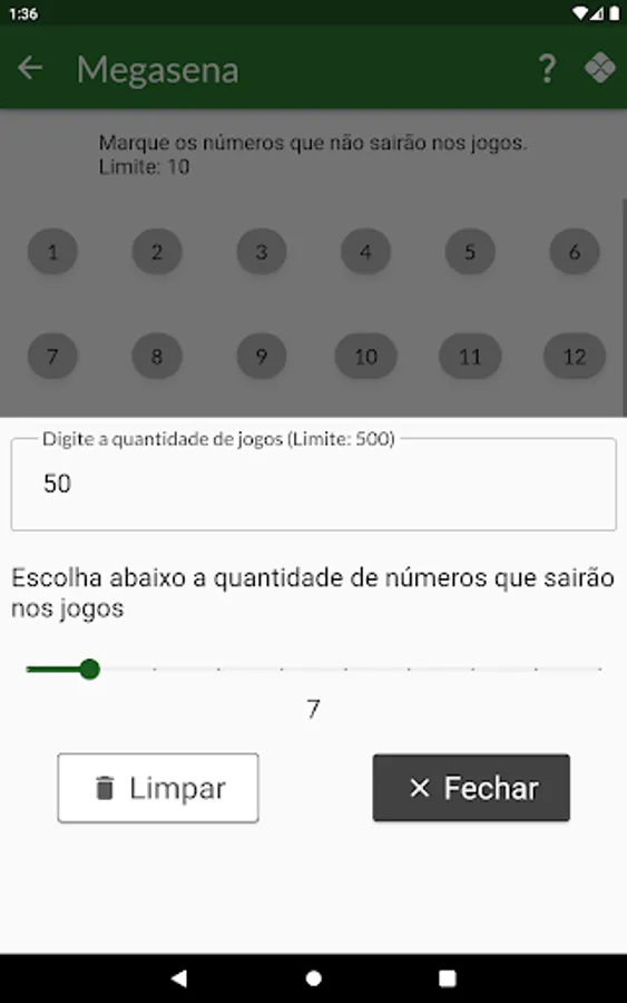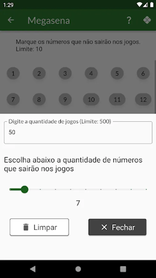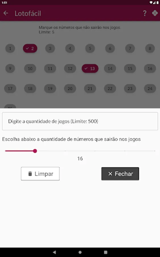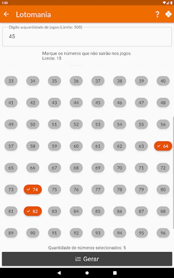 The user can remove a number of numbers related to each game category so that they are not generated.
