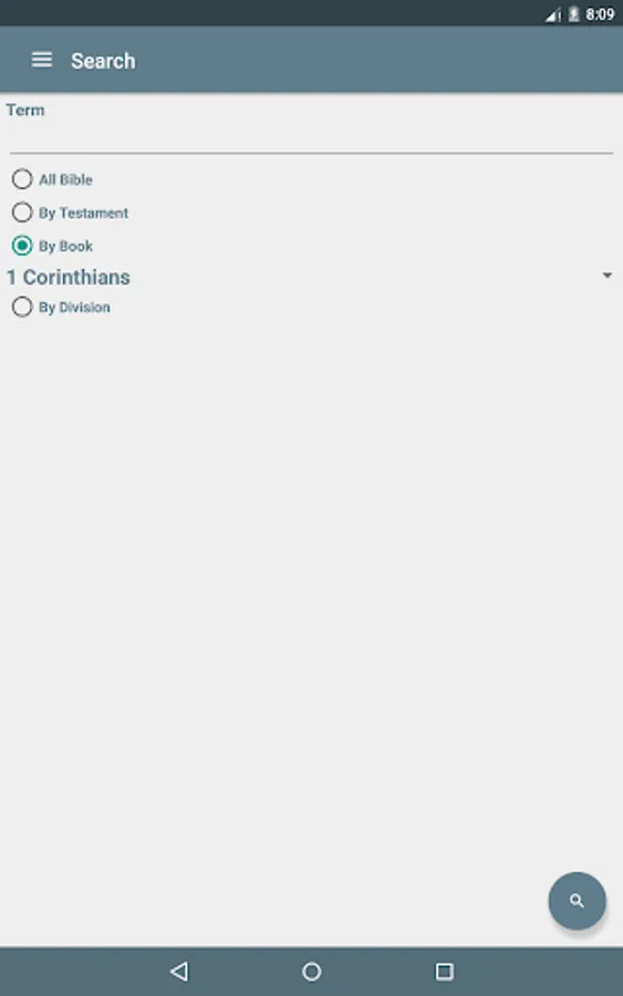 - Search Options: All the Bible, by Book, by Testament (Old or New), by division (Pentateuch, History, Books of Poetry, Major Prophets, Minor Prophets, History-Gospels, Church History, Paul's Letters, General Letters and Revelation);