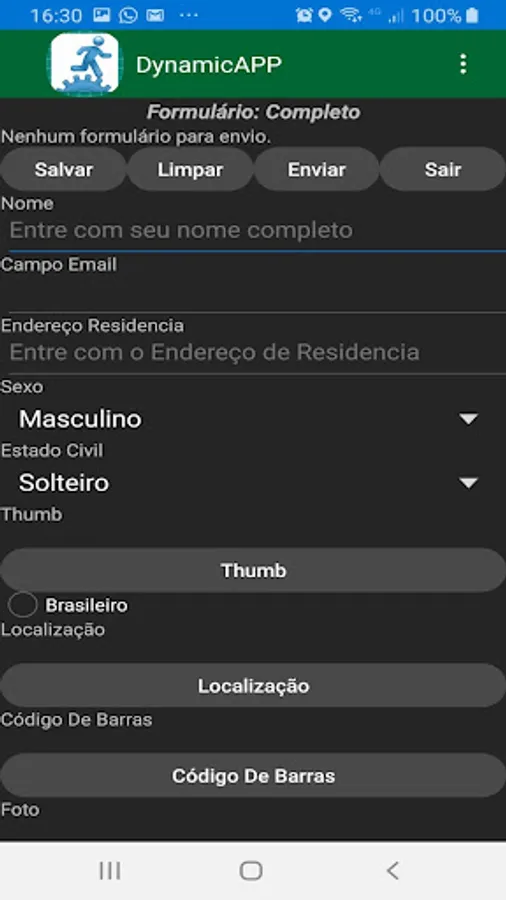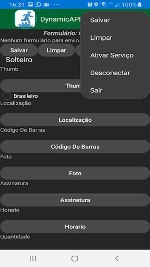 There are several types of fields available, such as free text, phone, numbers, zip code, email, time, CPF or CNPJ, checkboxes, GPS location, barcode scanning, high definition picture, low definition photo and up the application itself.