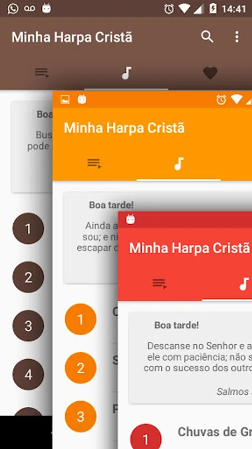 When entering and exiting the application A Harpa CRISTÃ you receive a biblical message and you can send verses to your friends and family being able to customize the message with the names of those who send and who will receive. You can also choose the message background and font. You can also choose your favorite hymns, share hymn lyrics and efficiently search hymns by name. You can change the theme (color) of the application, let your Christian harp with music with the style.