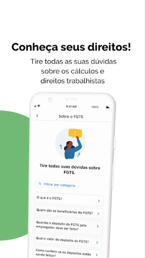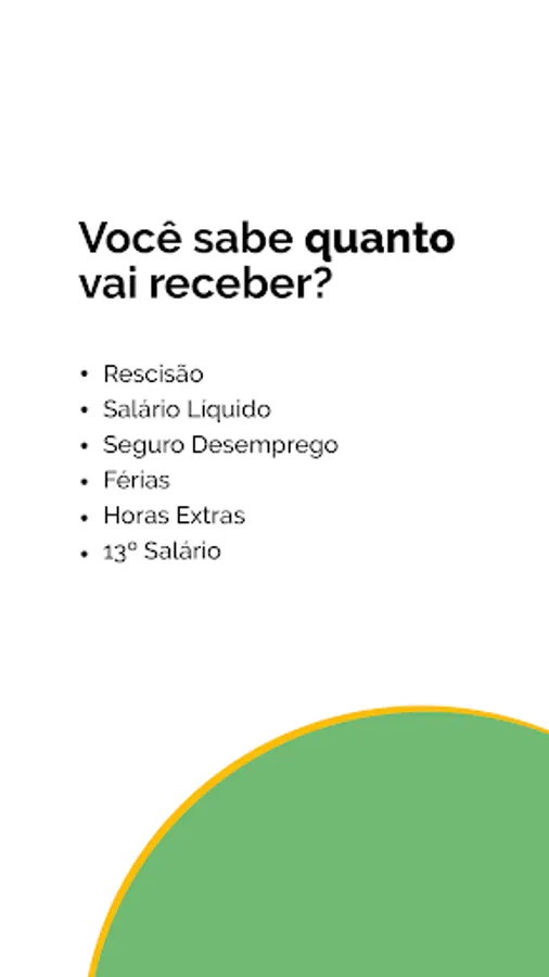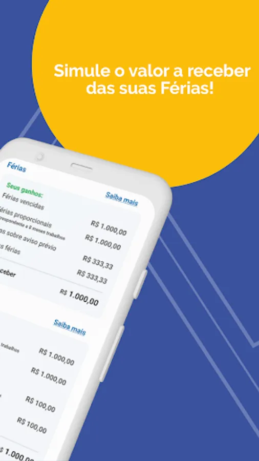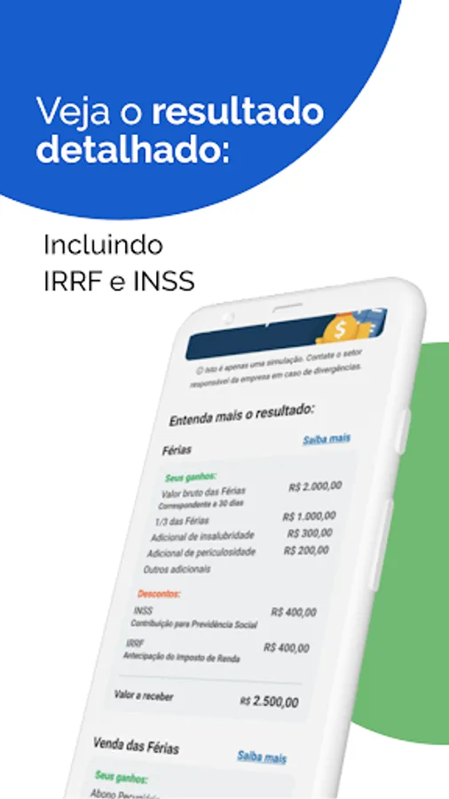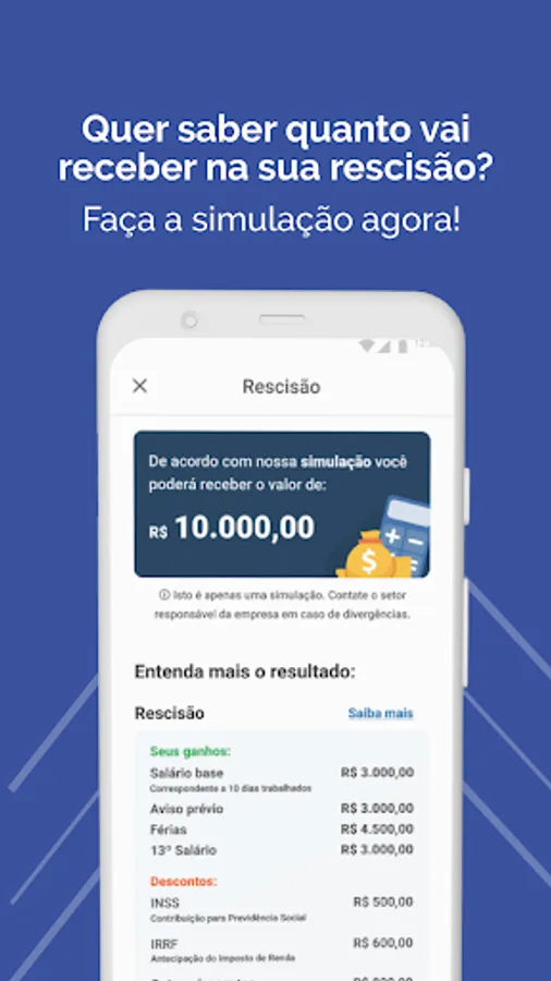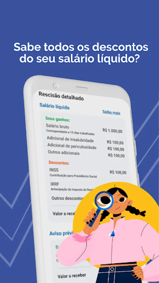 If you are going to take a vacation and want to know the amount to be received, the app also clarifies this for you. Or, if you want to know the value of your net salary without FGTS, INSS discounts and later with discounts, for example, we will explain everything there. We still help you by answering questions about the INSS discount, thirteenth, and more.