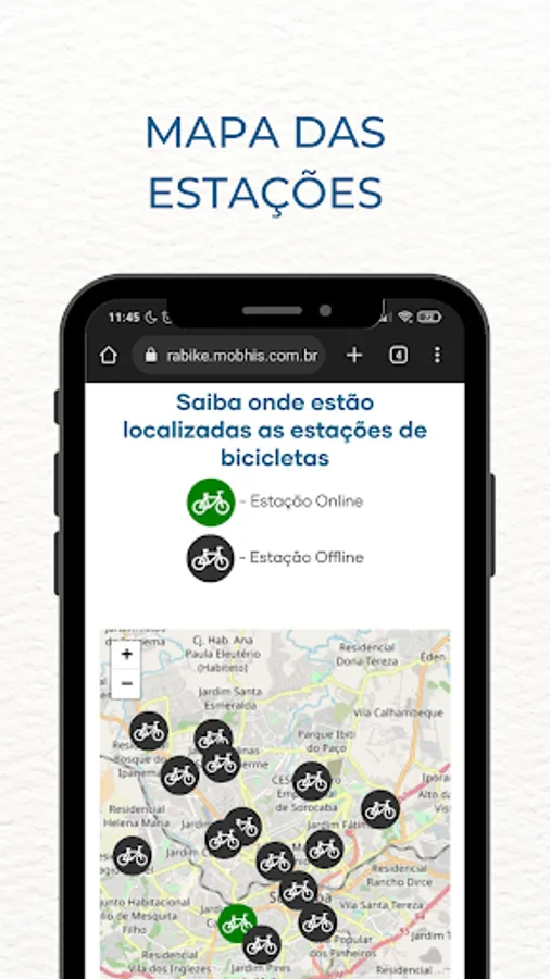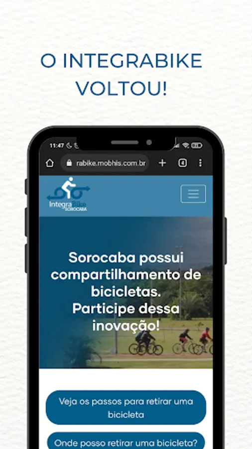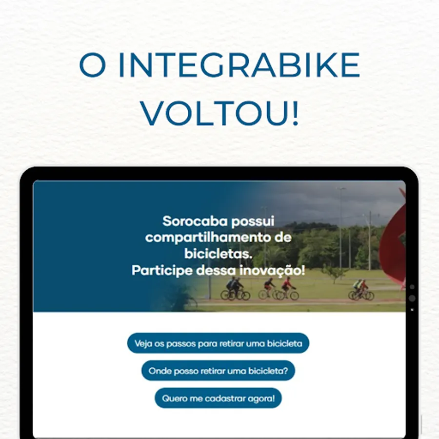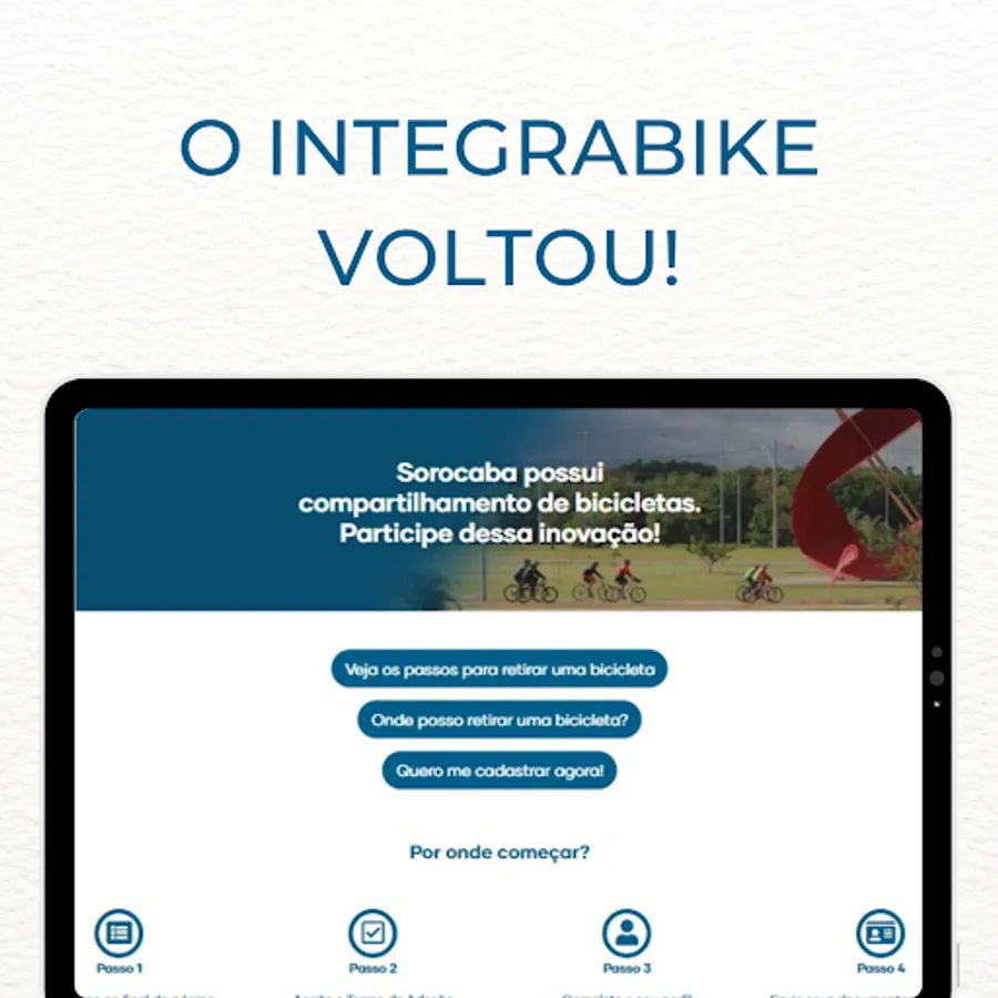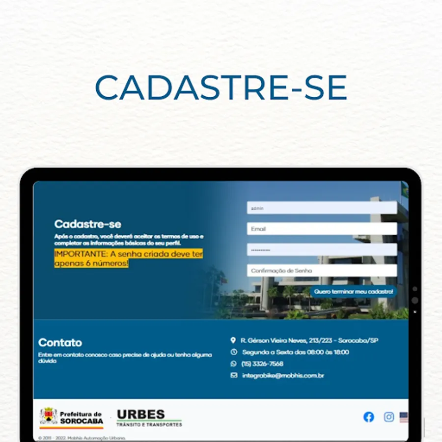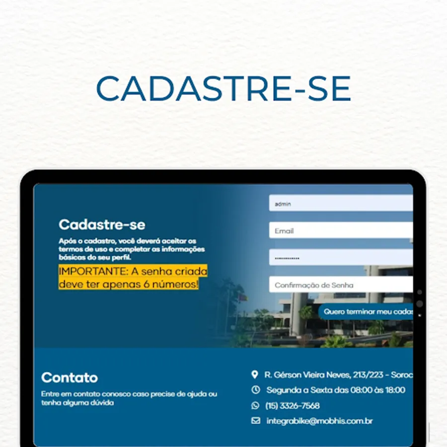 With this application you can register by providing some personal data necessary for the proper functioning of the operation. After this registration and analysis of your documents, it will be possible to pick up bicycles at stations throughout the city of Sorocaba using your transport card or your CPF number and a registered password.