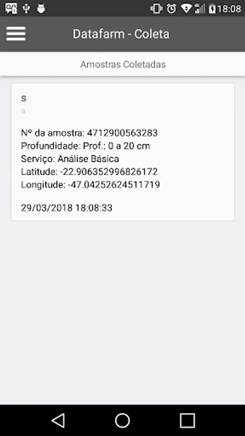 Application management sampling the field that can be used offline. Through guidance via GPS, the user identifies the collection site, performs the reading of the package bar code and records the depth of information gathering, analytical type of service, along with the user who collected. This information is organized and made available on the portal DataFarm which may be accompanied by the implementation of the analytical tests.