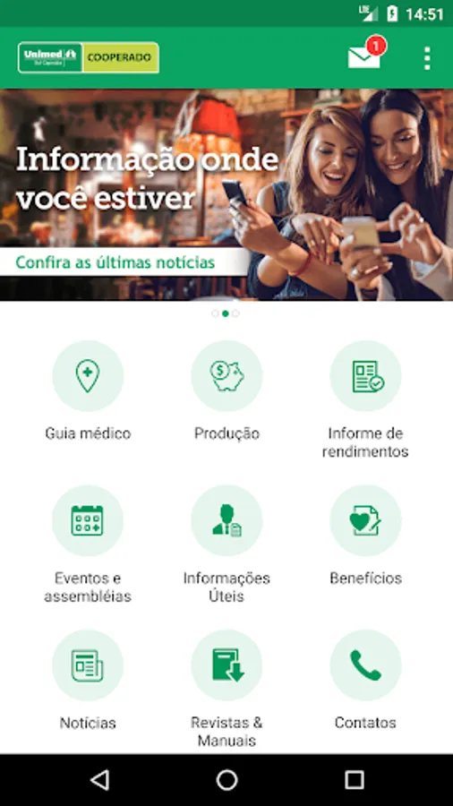 The Application Unimed Sul Capixaba Cooperative has a simple and intuitive interface. The APP provides a platform that takes key information from your service provider to the palm of your hand, in one click. In it, you, cooperated doctor will be able to follow the warnings and the news of his cooperative, have access to issues of the Bulletin and Bulletin We Radar. In addition, you can view your payment extract and your Physician Portal production report. It's technology as an ally of the real-time information to you.
