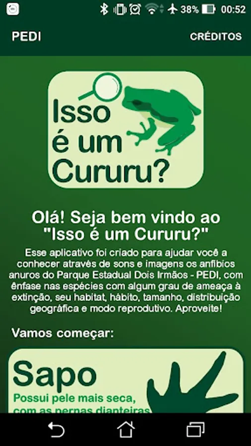 "Is this a Cururu?" is an environmental education and scientific research application with anuran amphibians, presenting the animals found in Dois Irmãos State Park, Recife / PE, but found in other regions of the Atlantic Forest in the Northeast. We highlight five species threatened with extinction.
