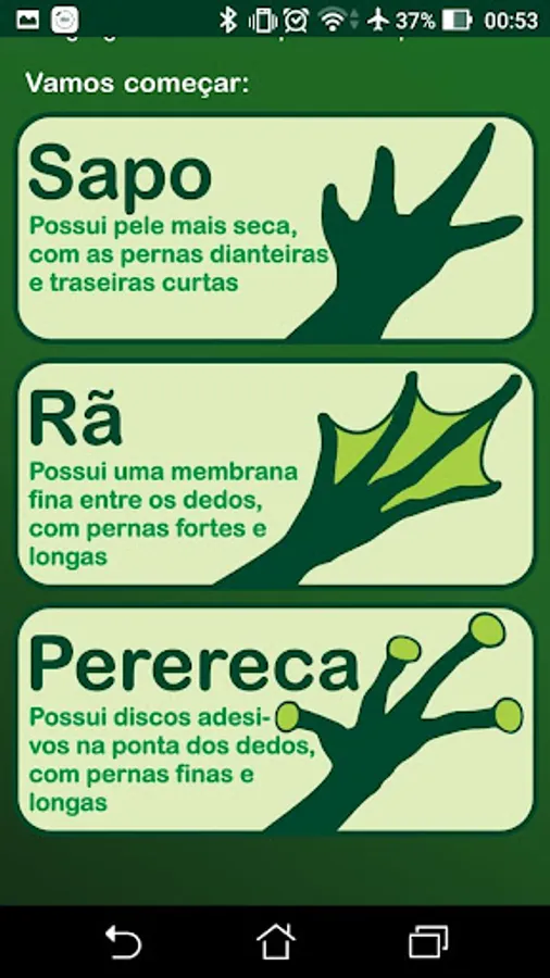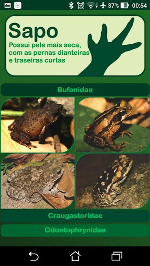 With it, you can find the animals divided into three groups: Frogs, Frogs and Frogs, as well as their families, with images, songs and information about them, such as: